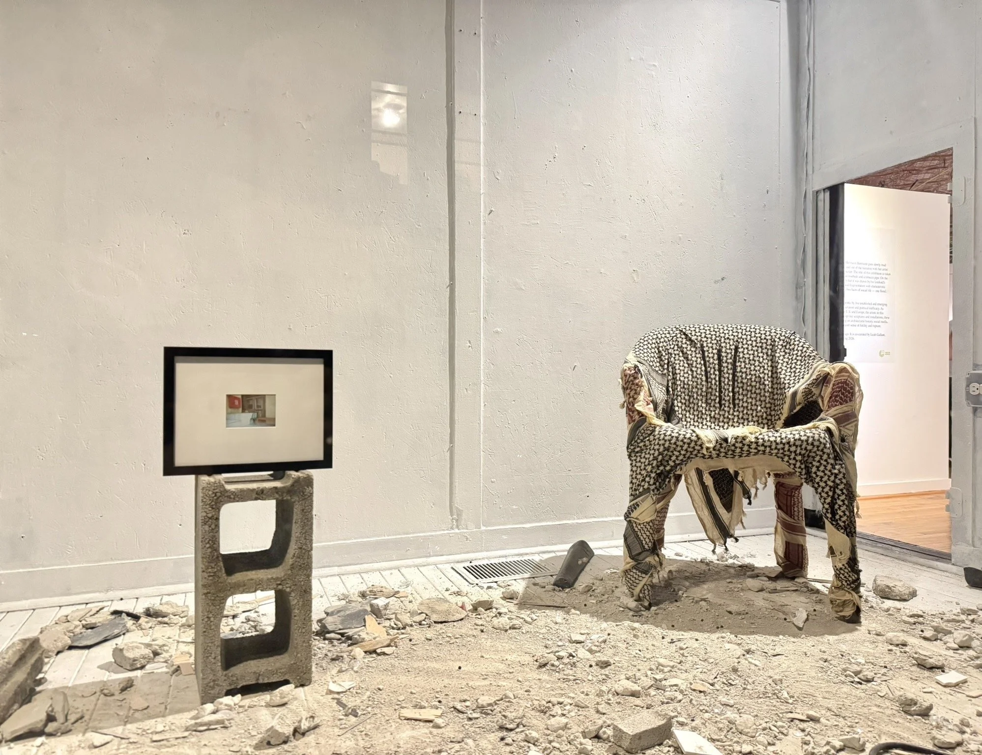 Co-Prosperity Sphere, the experimental art space under the umbrella of Public Media Institute, the nonprofit leg of the “Mayor of Bridgeport,” Ed Marszewski’s myriad of endeavors that span restaurants, brewery, publishing, art, and community organizing, opens with two shows that seem to represent two different reactions to the madness that is going on around the globe. In her solo exhibition When There is No One Left to Sit, Sayeda Misa Sourour traces absence and loss as negative spaces by lining the window vitrines of Co-Pro with a series of chairs. A chair covered with dust, a chair mutilated, chairs in rubble. The metaphor is clear; the atrocities are destroying the support systems of humanity. Inside, Two Roses and a Briar Pipe, a traveling group show co-presented by Berlin-based Scherben and the Goethe-Institut Chicago, gathers works by artists such as Adrian Piper and John Neff that verge on absurdity and futility.