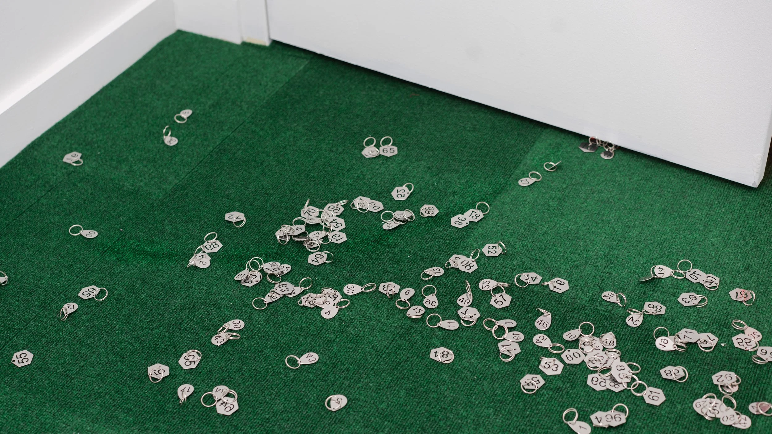 Li describes the titular video as a “minor imagination of the elevator,” opening up to the question of being and survival against normative structures. The work itself speaks to the anxiety of choice, the anticipation of ensuing consequences, and the opportunity costs, all of which may contribute to decision paralysis in our late-stage capitalism, which is exacerbated by Li’s meticulous, immersive site-specific installations. Number tags are peppered at the entryway. Ever-revolving treadmills frame the perimeter of the green carpet-lined main room. There are tiny papercut stars sprinkled on these treadmills, and throughout the course of the exhibition, some grasped onto the convey belt, whereas some fell to the ground.