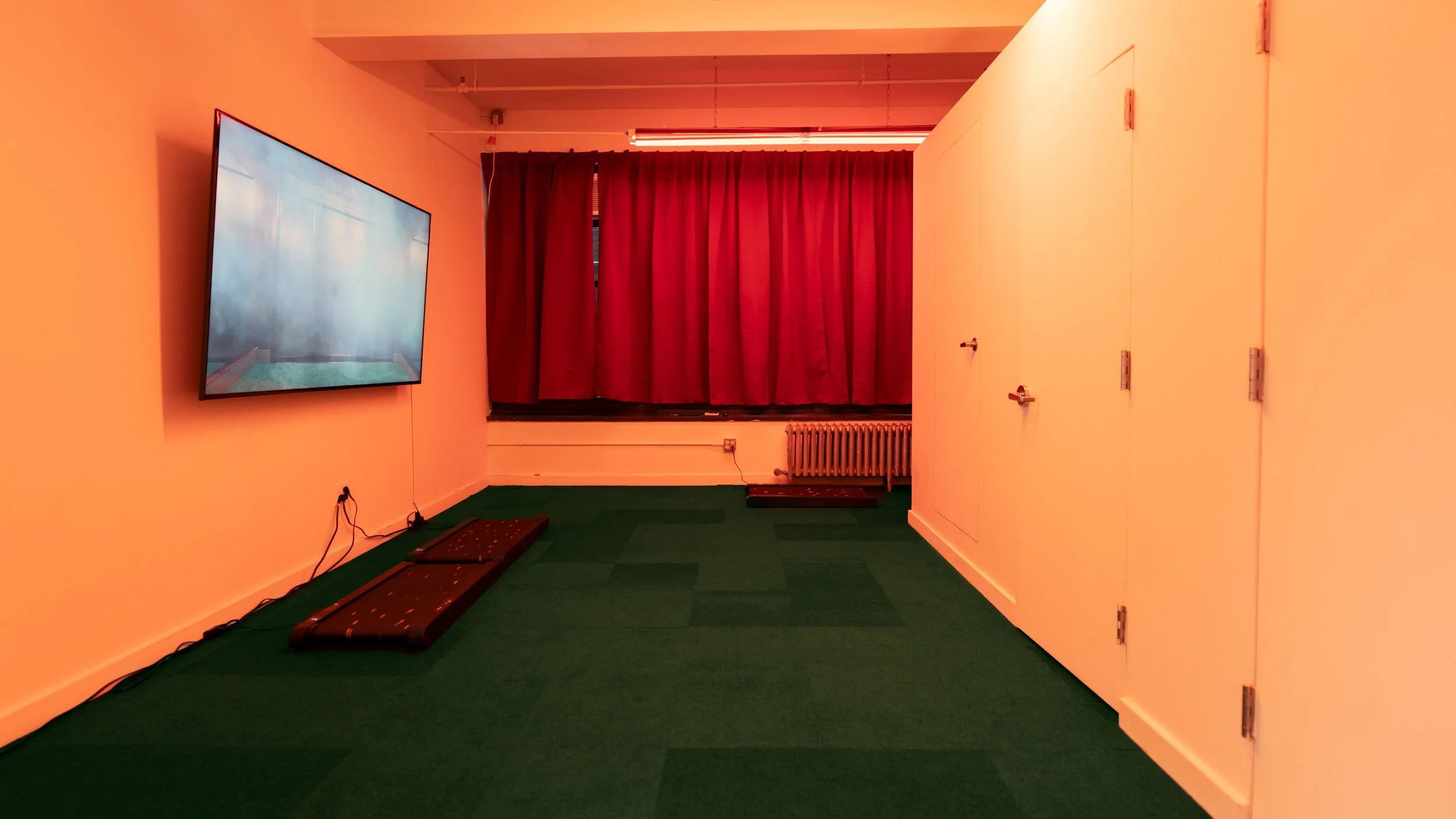 Amiko Li’s solo exhibition Nothing to do here but Wait is organized by the collective Mandarin Express. In a way, the experience begins when one steps into the lobby of the Herald Square mixed-use commercial building: through a gold-accented revolving door, one arrives before a brass-plated elevator of mid-century charm, echoing the computer-rendered elevator in the titular video work. Riding the elevator up, I could not help but think of Colson Whitehead’s elevator in his novel, The Intuitionist: at once a ruthless, mechanized can of vertical transportation and a symbol for social mobility. On the second floor, a corridor of identical doors is painted bright yellow. Names of the small businesses adorned the doors in a prescribed sans-serif typeface. The exhibition greets the viewer with yet another set of doors. The Monty Hall problem rears its head, but what is the prize at hand?