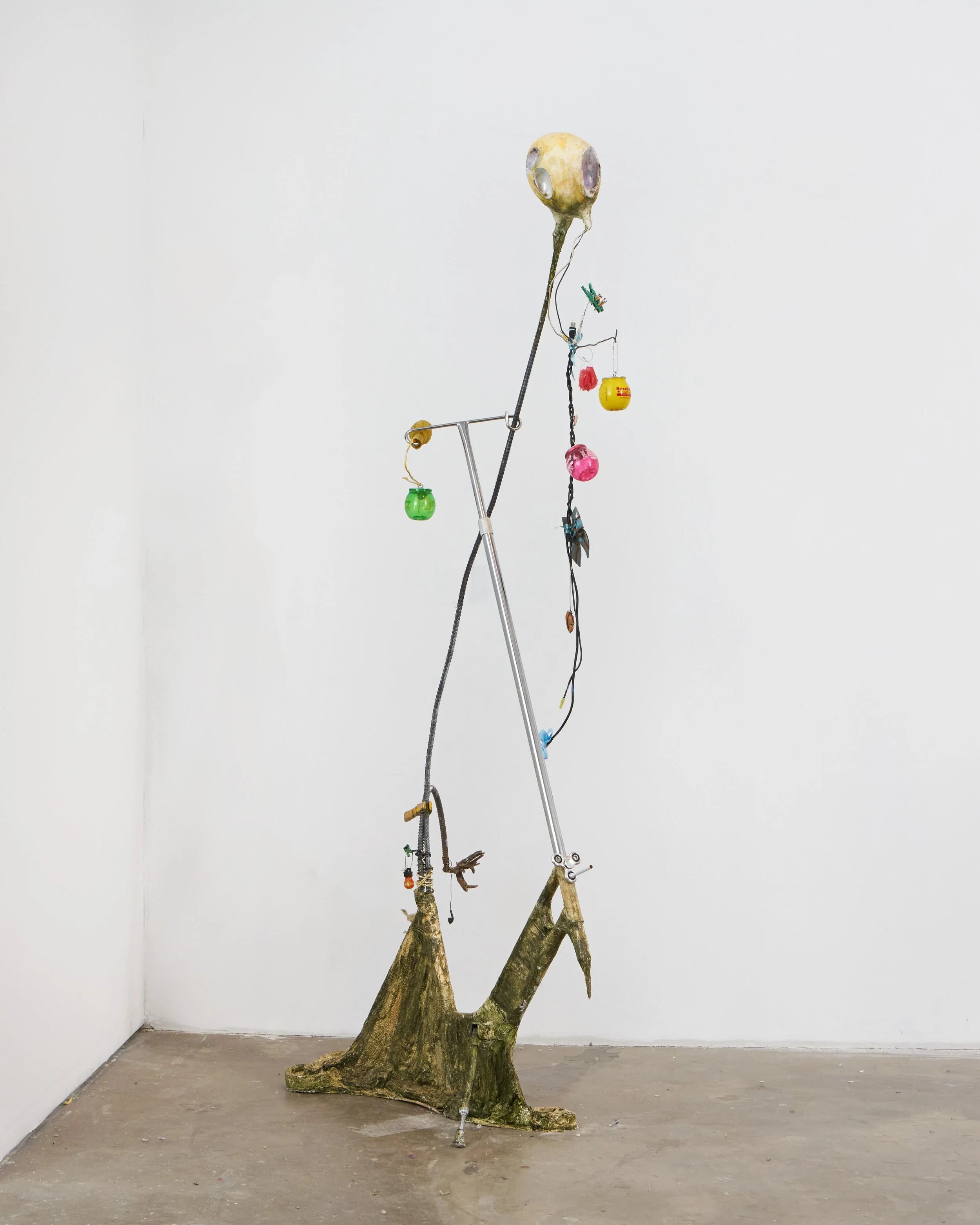 The diversity of products Smith finds through casual foraging in the streets—and the sculptures she creates from them—is truly incredible. Visiting her studio, I felt as if I had entered a post-apocalyptic amusement park. I inquired about a formidable structure hanging from the ceiling: a circular floating form, similar to how we popularly imagine a habitable space station, with what appeared like mold growing on its surface. Smith replied, “Oh, this is a fruit rack from a bodega that I flipped.” I was surprised, to say the least.