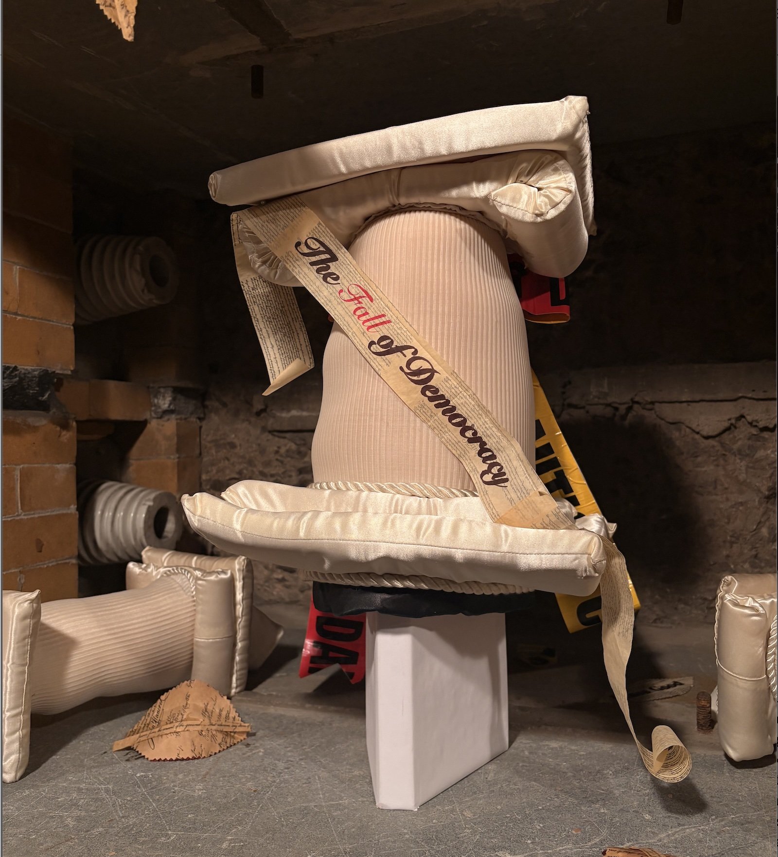 Fixed to the back of the hat is red and yellow tape printed with the words “danger” and “caution,” tied into a neat bow. Below the hat is an accompanying pair of gloves with two fallen Ionic columns serving as the cuffs. Hands attached to these columns hold leaves made from the Declaration of Independence between their fingertips. These leaves, however, bear the names Alex Pretti and Renee Good, two American citizens killed by federal ICE agents in Minneapolis in January 2026. Together, the hat, gloves, and inscribed leaves so clearly visualize how the architecture of democracy holds the evidence of its own failure.