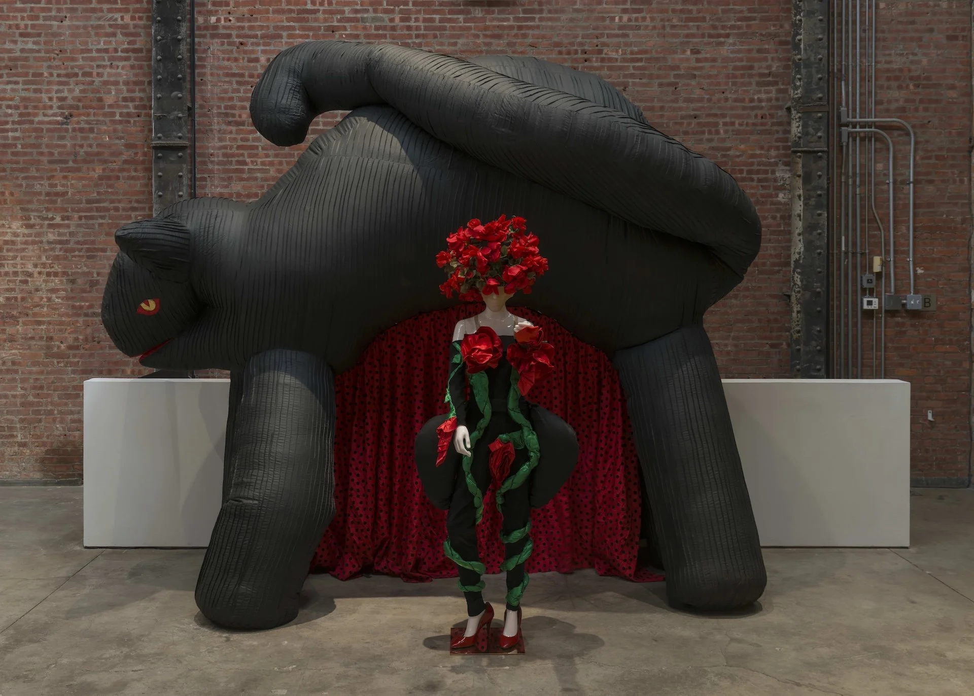 Miss Ill Cluster operates in conjunction with General Dismay (2007), WarUSaurUs (2007), and 3 Miss Ills (2007), all drawn from The Deportment of Corrections (2007), a performance done in response to the Bush administration’s attack on Iraq and the resulting “War on Terror.” Nearby is the costume Rrose (1989), positioned in front of an oversized feline inflatable, Big Pussy (1989). Rrose carries the original pun associated with Marcel Duchamp’s alter ego Rrose Sélavy—which sounds like “Eros, c’est la vie” (“Sex, that’s life”)—while also paying homage to the burlesque performer Rose La Rose, Oleszko’s mentor. By binding linguistic wordplay and burlesque spectacle, Oleszko stages the costume as a site where language and the body perform in tandem. Rather than resolving as a joke, the costume becomes an anchor that sits between Dadaist conceptualism and popular performance traditions, grounding innuendoes in physical form.