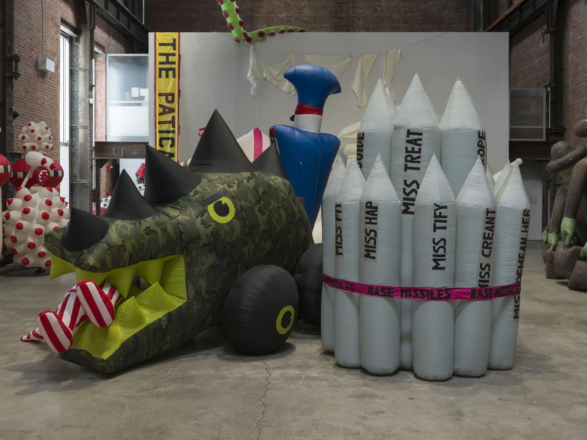 Massive, bulbous inflatable sculptures overrun the ground floor, with some suspended from the ceiling. At the center is Miss Ill Cluster (2007), an inflatable bundle of upright grey missiles cinched together with a hot pink band. Each missile is inscribed with a “miss” pun: “miss deed,” “miss represent,” “miss fit,” “miss hap,” “miss tify,” “miss demean her,” “dis miss,” “miss chief,” “miss treat,” “miss conduct,” and more. Playing upon this feminized form of address, the modular “miss” puns transform the logic of militarized aggression into wordplay, embedding critique directly onto softened weaponry. Certain puns hint at the failures of rigid structures of authority that misidentify, misvalue, and misplace individuals to show how easily misrecognition occurs when a person is misnamed or miscast. Other puns target institutions that misrule, mislead, and mismanage—often not by mistake.