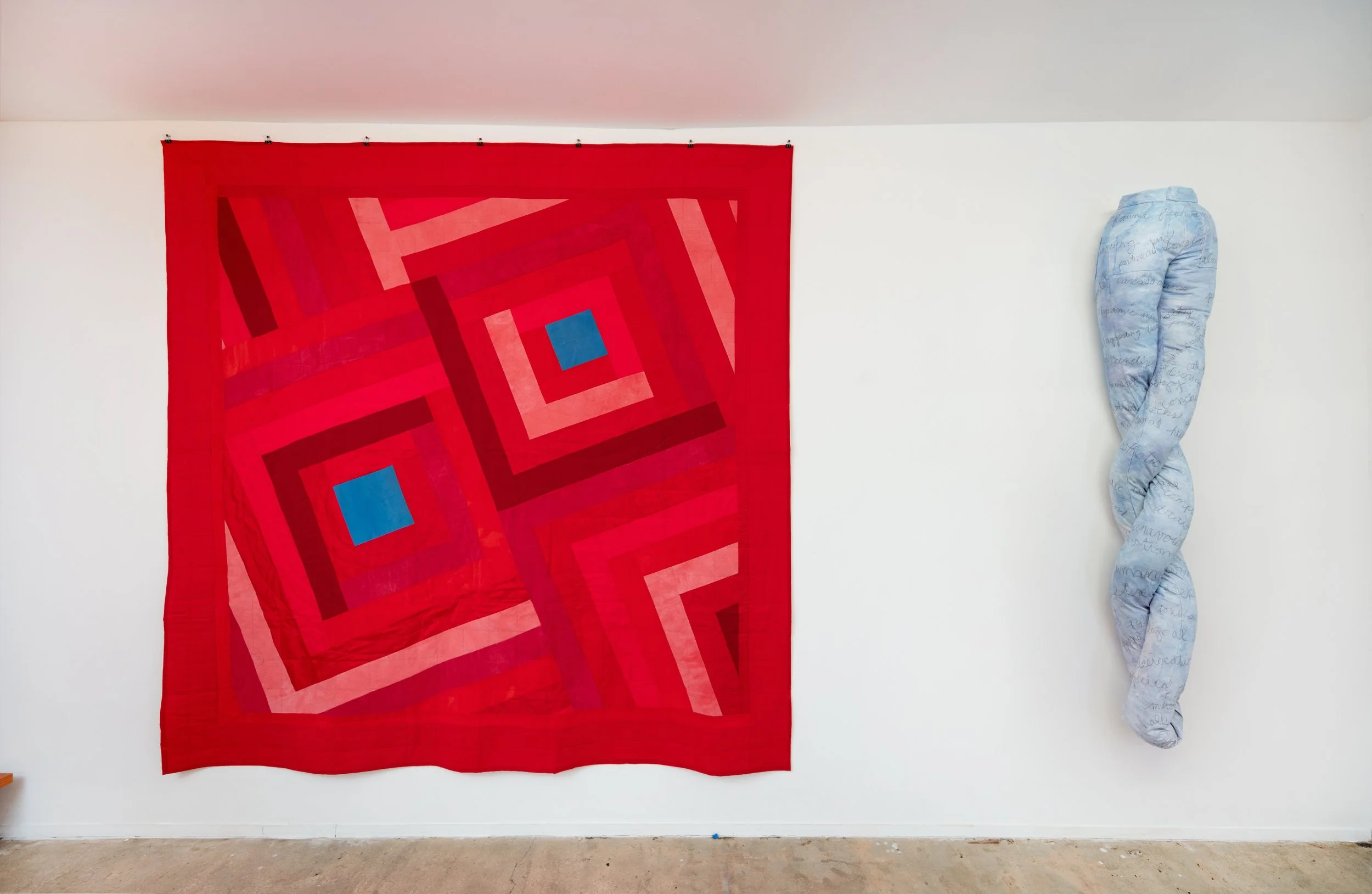 A standout in the exhibition is Gloria (2025), a sculptural textile piece that gathers multiple lineages into a single form. It begins with a classic fan-motif quilt—an aesthetic associated with women’s domestic labor and improvisational creativity. Gast’s interventions use cochineal and goldenrod dyes applied with resist techniques that follow the quilt’s pleats and folds. From this foundation, the piece spills upward from a polished pocket of vintage cut-off denim, forming a lush crescendo of textile and color.