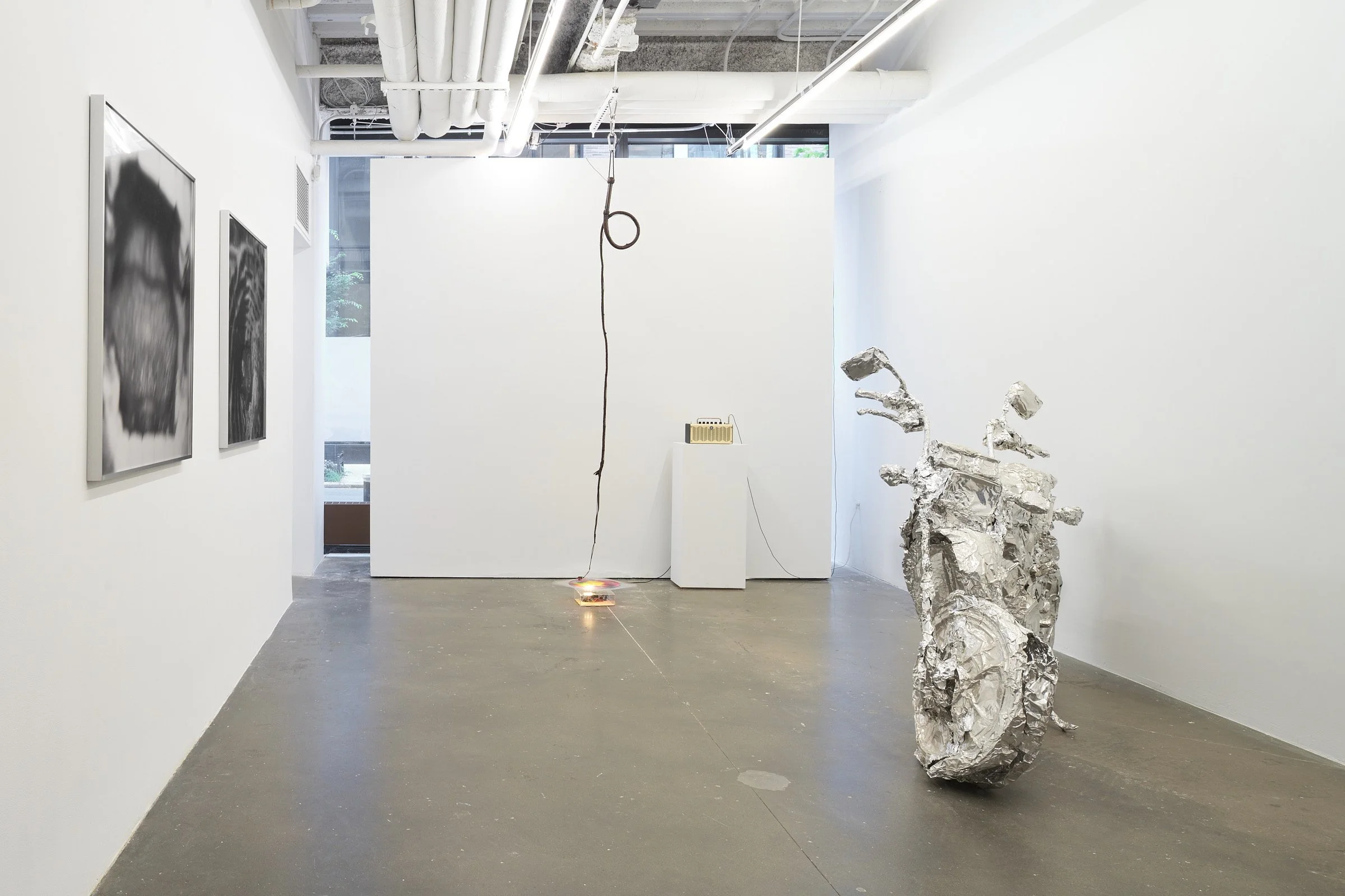 Nonetheless, the curators did not entirely forgo material considerations as a unifying force, or more precisely, the lack thereof. Instead of complete absorption in a plurality of references, No Handlebars converges at its elemental level. In other words, even to drift, one requires a raft: some common ground. In No Handlebars, it is air. Air functions throughout as both medium and metaphor—the condition that enables movement while marking the spaces between things. Shen’s rotating vinyl played by a whip-connected needle fills gallery space with sound that exists only in motion. Gale’s x-ray-like prints reveal internal cavities, the hollow spaces within bodies and objects. Even Wanthiang’s floor piece creates pockets of negative space that viewers must navigate around and through.