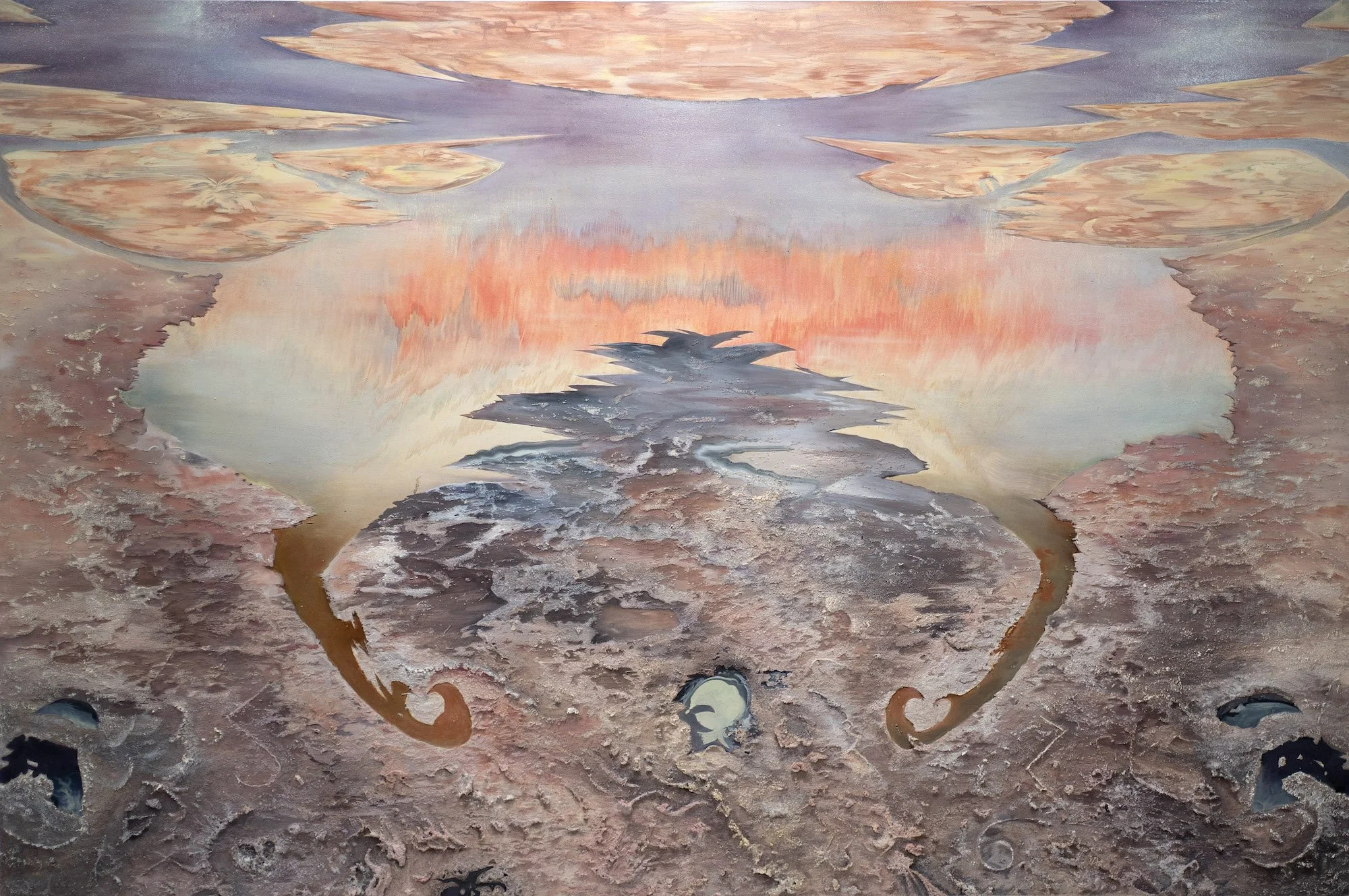 Thorp underscores the expansiveness of the earth’s knowledge through her broad, sweeping treatment of boundless scenes. We Met Before Flamingos pushes against the boundaries of the panel, its symmetrical expanse of water rushing into the top two corners. In the center of the composition, the rosy pink sky is reflected in the rippling water, suggesting the perpetuity implied by a mirrored surface. Piercing the pool is a serrated peninsula, which fans out to either side past twin deltas resembling flamingo feet. The surface of the ground is dotted with constellations of canyons, ridges, and spiral jetties, sparkling subtly like distant stars.