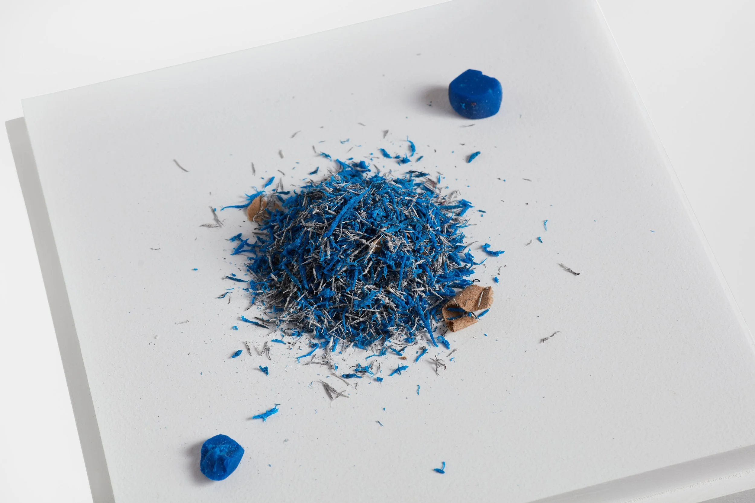 Mere blocks away, Bethany Collins’s Dusk utilizes selective retelling to depict the death of the empire. Her Loss series (2024–2025) recreates single pages from the classic American novel Moby Dick; or, The Whale, blown up to life size and furiously erased, leaving only a handful of phrases visible. What’s left is meditative poetry that recollects a tumultuous and all-powerful sea. Collins fights against the story, one taught through generations, smudging the ink and ripping the paper like an angry student attempting to comprehend the tome. Eraser fragments litter the bottom of the frame: evidence of her grapple. On nearby pillars, Collins displays sculptural mounds of the used blue erasers, whittled into oblivion. The remains are pyramids of the dusted artifacts of her process that transmute the text into meaning. In the final room, she leaves the final words from the last chapter, “then all collapsed, and the great shroud of the sea rolled on as it rolled five thousand years ago.” Collins’s work uses reinterpretation to extrapolate the immutable. What remains is none of the individual actors, but the environment that hosts them: persistent currents of culture. Through tedious reproduction, Dusk exhausts the American cannon and begs for a new order.