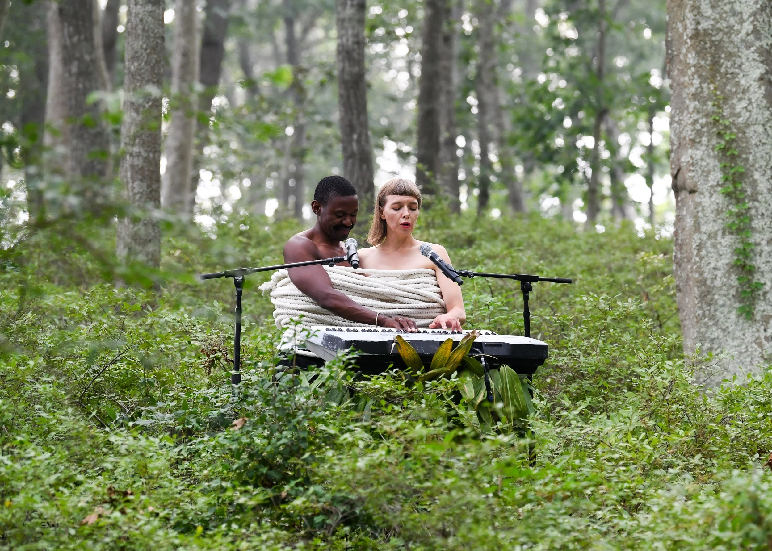 The bus arrived just before sunset, transporting me from the sweaty city into crispy and enchanted air. As I walked uphill along a path lined with torch flames and leafy trees, classical music drifted through the crowd of newly arrived visitors, casting an atmosphere of grandeur. While the last shimmering rays of sunlight filtered through space, two entangled bodies appeared, performing Children’s Games by artist Lina Lapelytė and composer Thuthuka Sibisi.