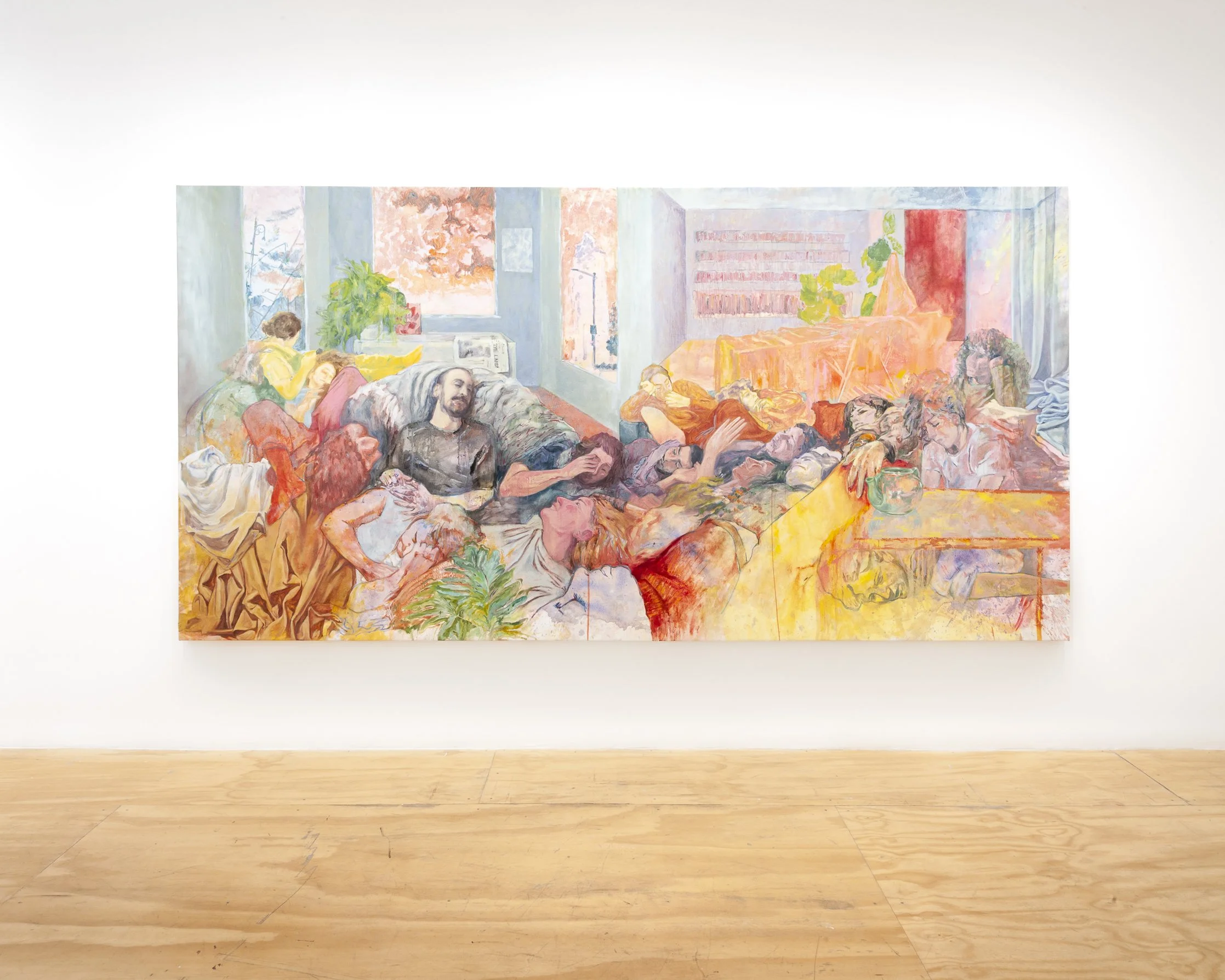 Make Room’s second location is a lofty high-rise apartment in Downtown LA, its access requiring an appointment and a personal escort from Zachariah Buteux, the gallery’s associate director. A sterile entrance and elevator ride is soon replaced by a cozier interior: a studio apartment-turned-gallery space, complete with a kitchen, bathroom, and multicolored velvet floor sofas. An iteration of Make Room’s “In Situ” series, Youngmin Park’s solo exhibition Holes in the City is in true dialogue with its location. In departure from many of her previous large-scale paintings, the artist activates site specificity in a much more restricted scope than the genre’s predecessors, citing its core tenets yet eschewing the sensationalist artmaking gesture.