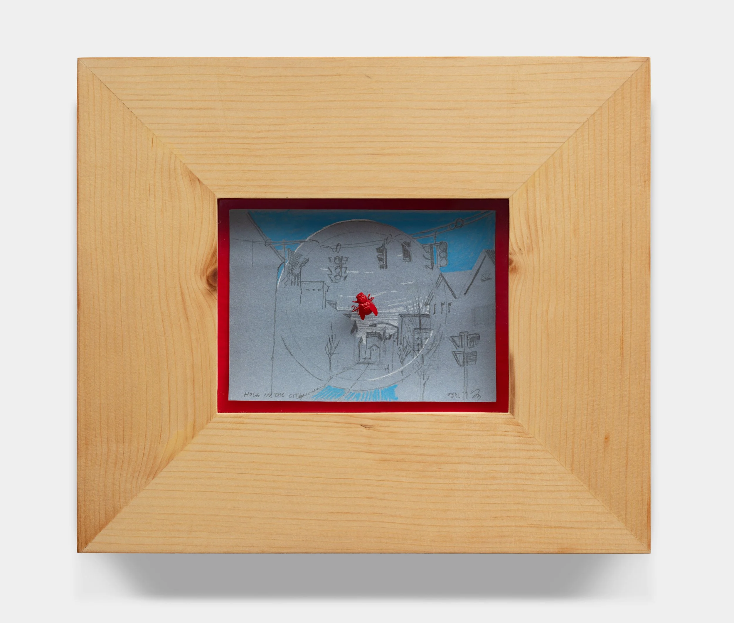 In her current solo show, Park, who also tends toward figurative work, turns to cityscapes and the understanding of one’s place within them. While each piece has its own affective color palette, Park seems not to portray urban landscapes with any bias; rather, she exposes their potentiality for stillness. This is achieved, in part, by a precise and strategic framing, both in what is allowed to be seen and the physical spatiality of each work. Hole in the City (2025) is framed by six-inch-thick raw wood, which focalizes its subject: a bright crimson ceramic fly pinned to the center of a small, grey streetscape sketch. The terrain of Wavering gaze (2025) is eclipsed by a face staring directly at the viewer. City eyes (2025) foregrounds two traffic lights, the infrastructure of the surrounding city blurred into a serene dusk. Between examining each work, the viewer is confronted with floor-to-ceiling windows that overlook Downtown LA’s skyscrapers, parking garages, and warehouses. The muted rush of the city is impossible to overlook; it, too, becomes part of the exhibition, its commotion noticeably silenced.