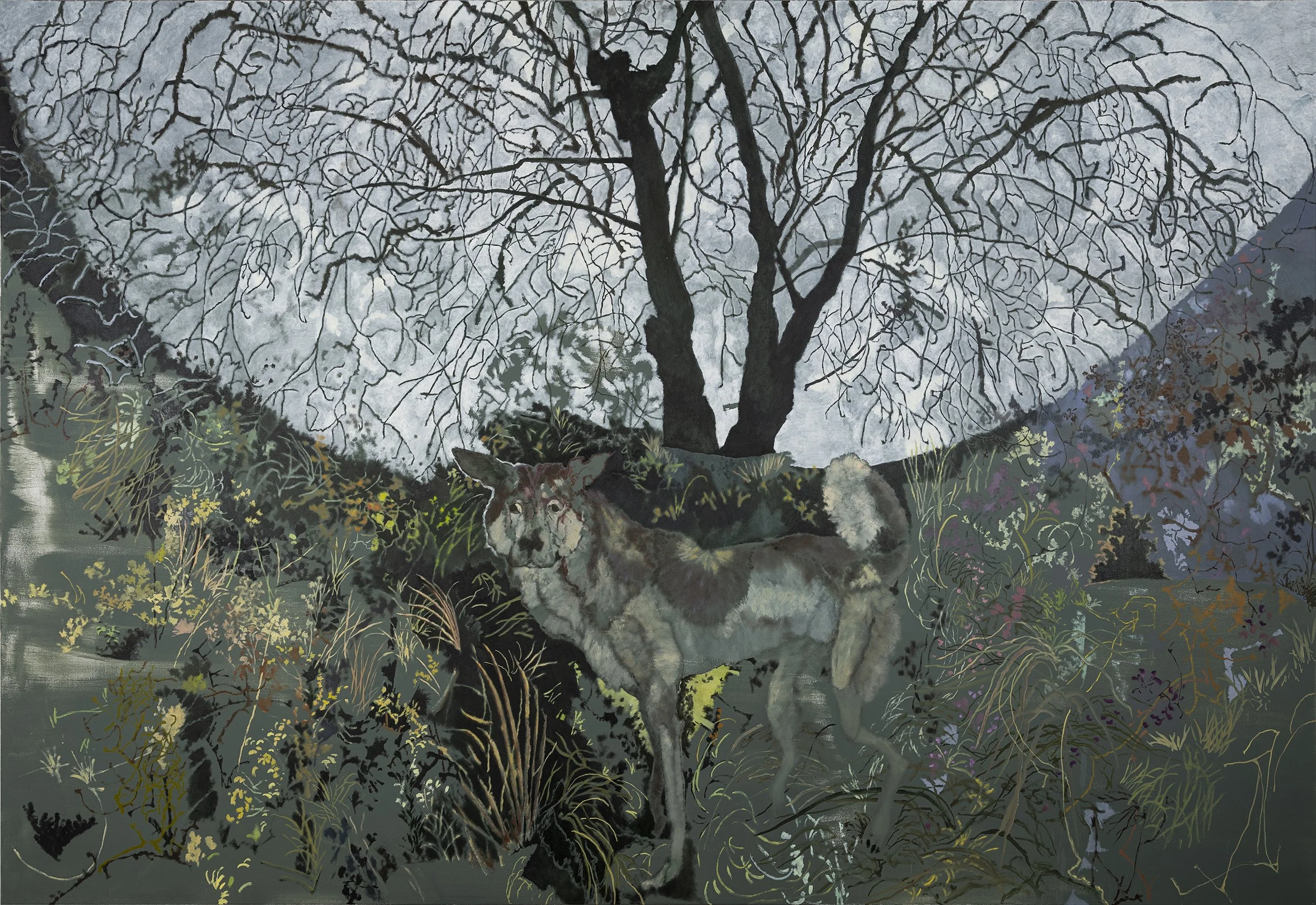 Huen recreates moments from his day-to-day life in his paintings, drawing out the “unspoken beauty and quality in the everyday” in his work. Huen’s dream-lit scenes are mercurial and cloudy, reflecting their fleeting nature. Soft brushstrokes punctuate misty landscapes of the Sussex countryside, tracing verdant spaces and canine silhouettes.