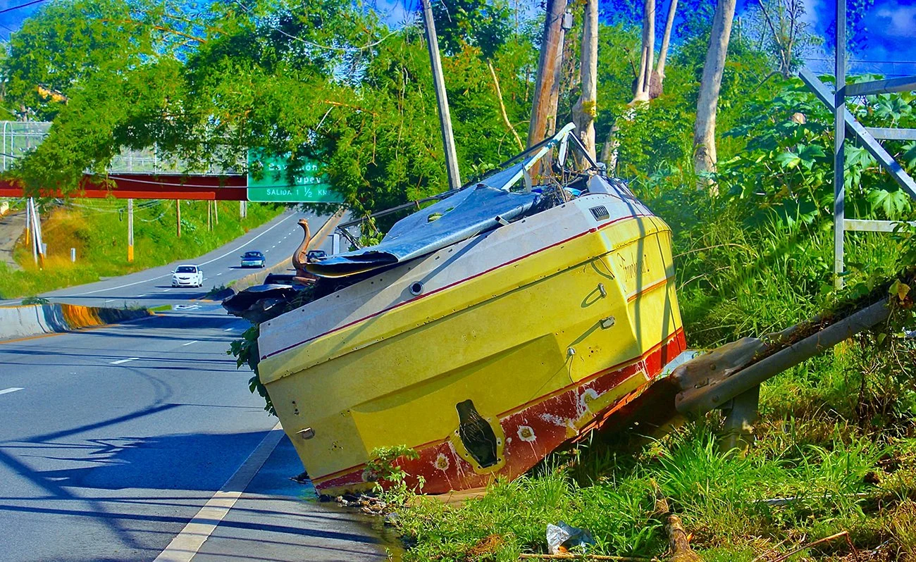 Natal-San Miguel has revisited every single one of these structures and locations since 2017, many of them remaining unchanged. An image that stuck with me over the months since the show’s opening, Boat (2019), documents a boat washed up on the side of a road in Guaynabo. Large and hulking in the frame, it sits tilted on the highway, wrecked, with no water in sight—one can only imagine how far the hurricane carried it to its final, inconvenient resting place. “It’s still there,” Natal-San Miguel remarked. “I’ve been back several times. It just sits there. No one moves it.”