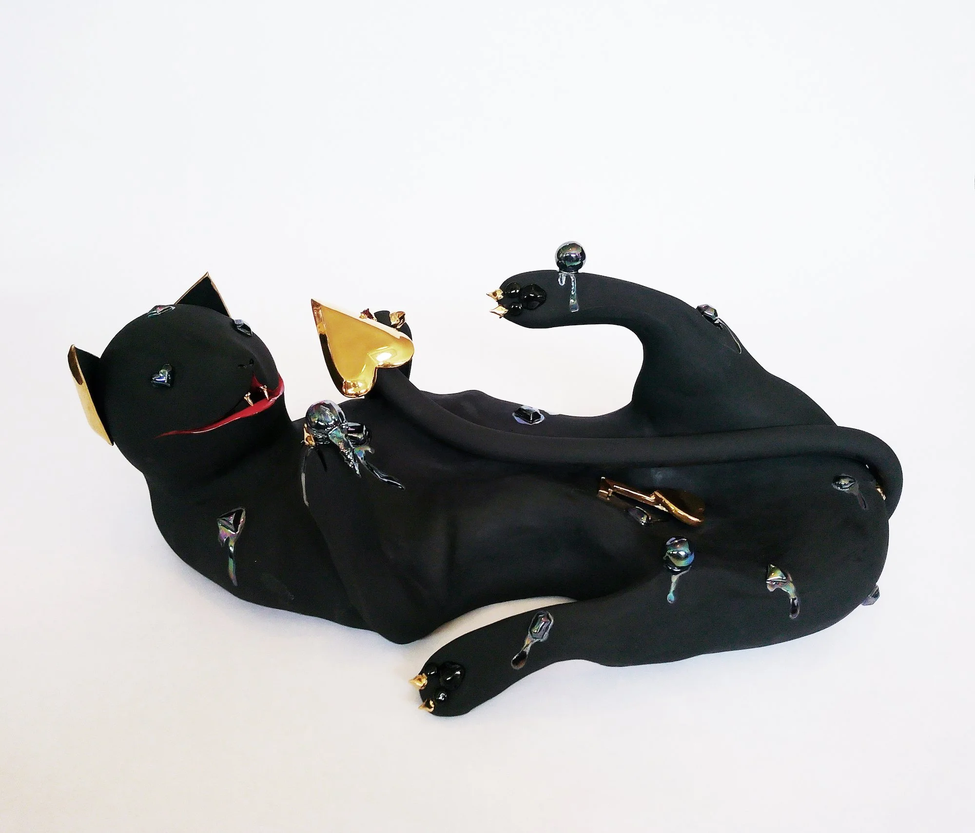 Critically acclaimed ceramicist Alex Anderson examines beauty, desire, and power through refined sculptural forms. A graduate of Swarthmore College and UCLA, and a Fulbright scholar at the China Academy of Art, he blends classical elegance with contemporary critique. His Bergdorf-featured ceramics, each accented with gold luster, were inspired by Aladdin’s Cave of Wonders, including a matte black and pearlescent glazed wall-text sculpture reading “Everything You Ever Wanted.” Shown in a landmark retail destination where abundance reigns, his work underscores how objects embody both cultural aspiration and vulnerability.