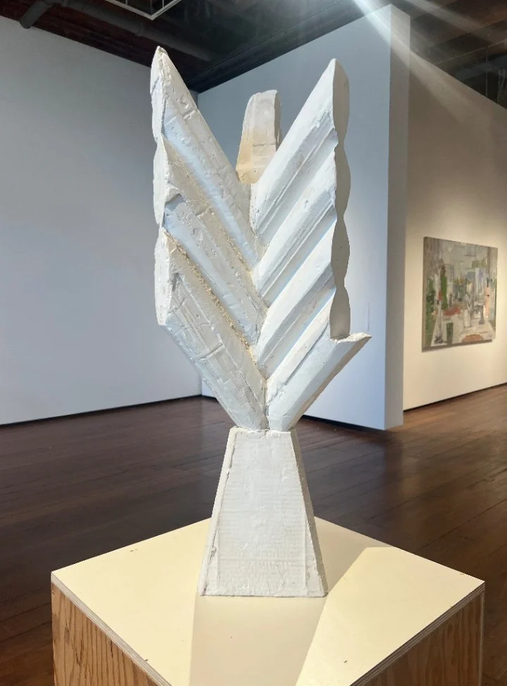 The cast plaster LIFE FORCE OBJECT (2025) appears like a shimmering white fletching—an arrow buried in the ground, its momentum thwarted, left in the ruinous vestiges of a battlefield. Its surface alternates between smooth and uneven, playing between glare and shadow—a contrast heightened by the piece’s angularity. A jagged point on the right gives us the impression it had been broken off, and just above where the base meets the feathers, there’s a subtle, rust-colored spatter as if the piece had been left to oxidize out in the elements. At the risk of losing this remnant of the past, weathered by time with its rough, wind-hewn edges, Tennis has placed it in the CONSERVATORY to save it, immortalizing the sculpture in a place outside of time.