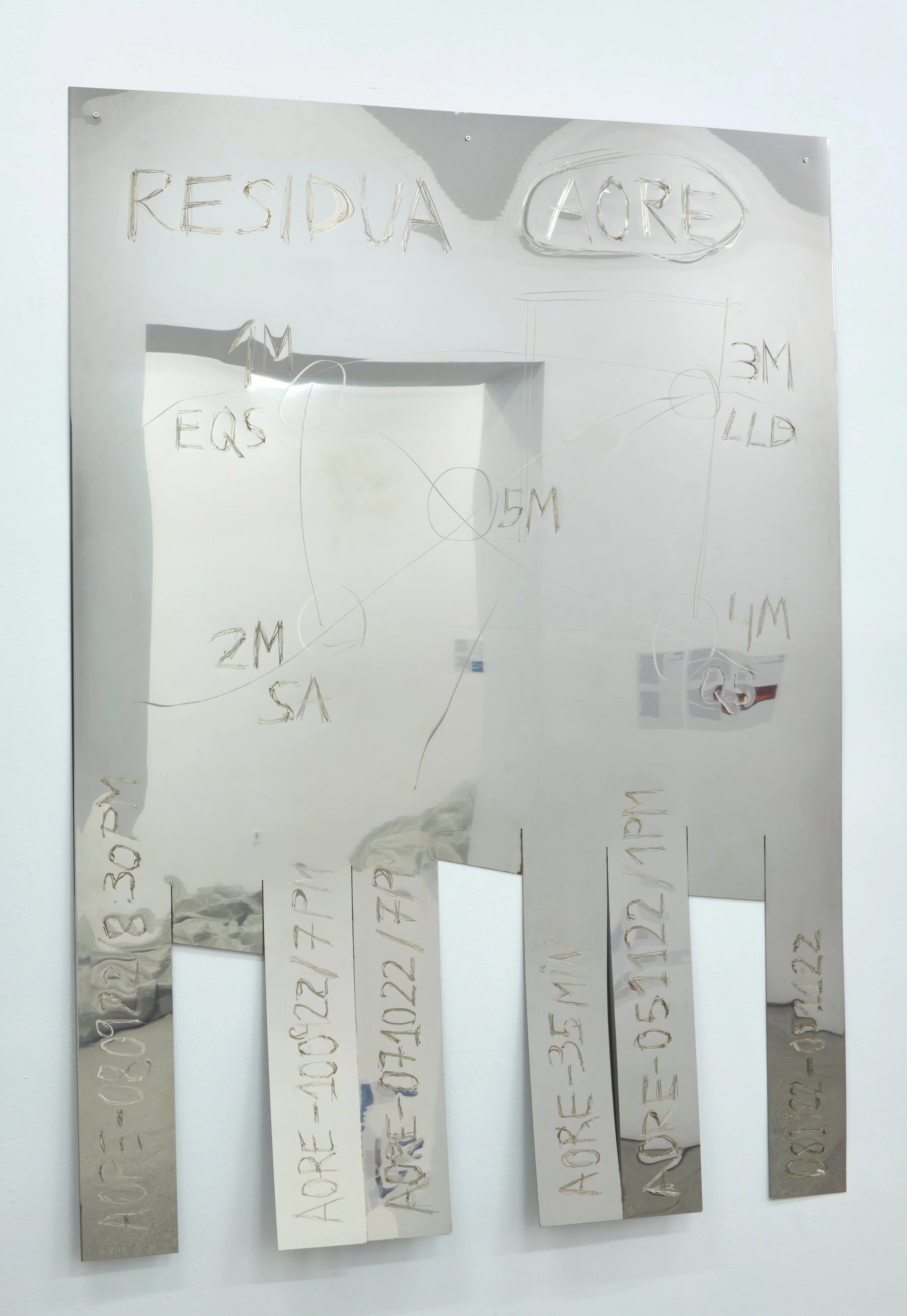 If you get closer to the works, you will notice that some of them are marked with handwritten inscriptions: words, numbers, and scribbles that seem to create a record, or a kind of accountability, of past actions upon matter. This mark-making practice melds together the different media the artist navigates and has been a fundamental element in her work since her early performances. Between documentation and dramaturgy, her scoring configures a choreographic strategy that allows her not only to remember but also to communicate unspoken stories. But the exploration of these “living sheets”[2] goes beyond the gesture of scratching or writing over a bright, polished surface: a sense of virtuality spreads over Estruch’s practice, informing both the formal aspects of her research and her exploration of language and orality. As a collapse in the cohesion of time and memory, an overlap of narratives and cultural symbols, or just as a trace of a previous movement in the space, virtuality always brings some kind of dislocation to the present moment. That which was missing is now breathing, even if it remains vague or evanescent.