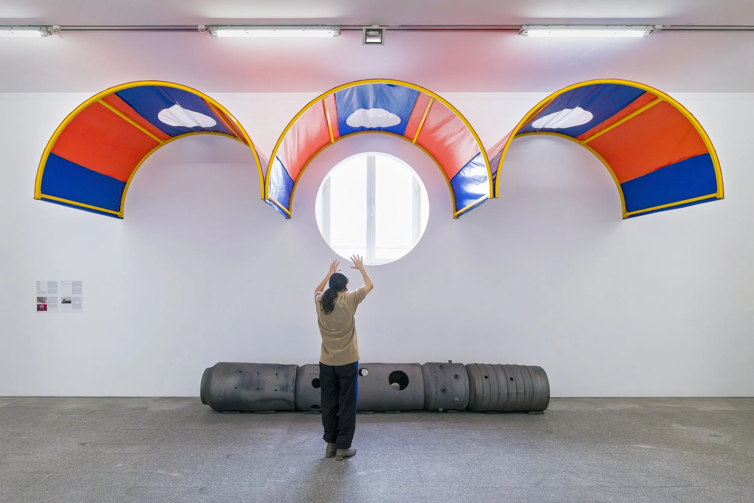 Among the twenty-seven works shown in the exhibition, a selection of sculptural pieces—initially thought of as stage designs by the artist—spread industrial, playful imagery across the space. As if a kid’s modular game had expanded tenfold, overflowing from the realm of imagination, these monumental works highlight the predetermined nature of the contemporary scenarios we enact. Out of scale and context, in a concatenation of apparently fixed positions, they seem to expose the inherent performativity of our social machinery, revealing the plasticity of the patterns we reproduce daily. But something else is missing—these pieces aren’t just waiting until the next reenactment. Some of them have changed in shape, appearance, or position since they were first manipulated; some of them contain whistles, melodies, and screams inside a structure that just appears to be silent. Estruch’s formal research aligns with the political understanding of infrastructures as interconnected living networks. Often invisible within a seemingly stable order, these networks open up possibilities for resisting its systemic, oppressive dynamics.[1] Her sculptural installations are, therefore, ephemeral architectures that carry a political agenda. Whether they are theatrical fantasies or living bodies, they are not structures, but infrastructures: they are always in the making, always exceeding the memory we hold of them.