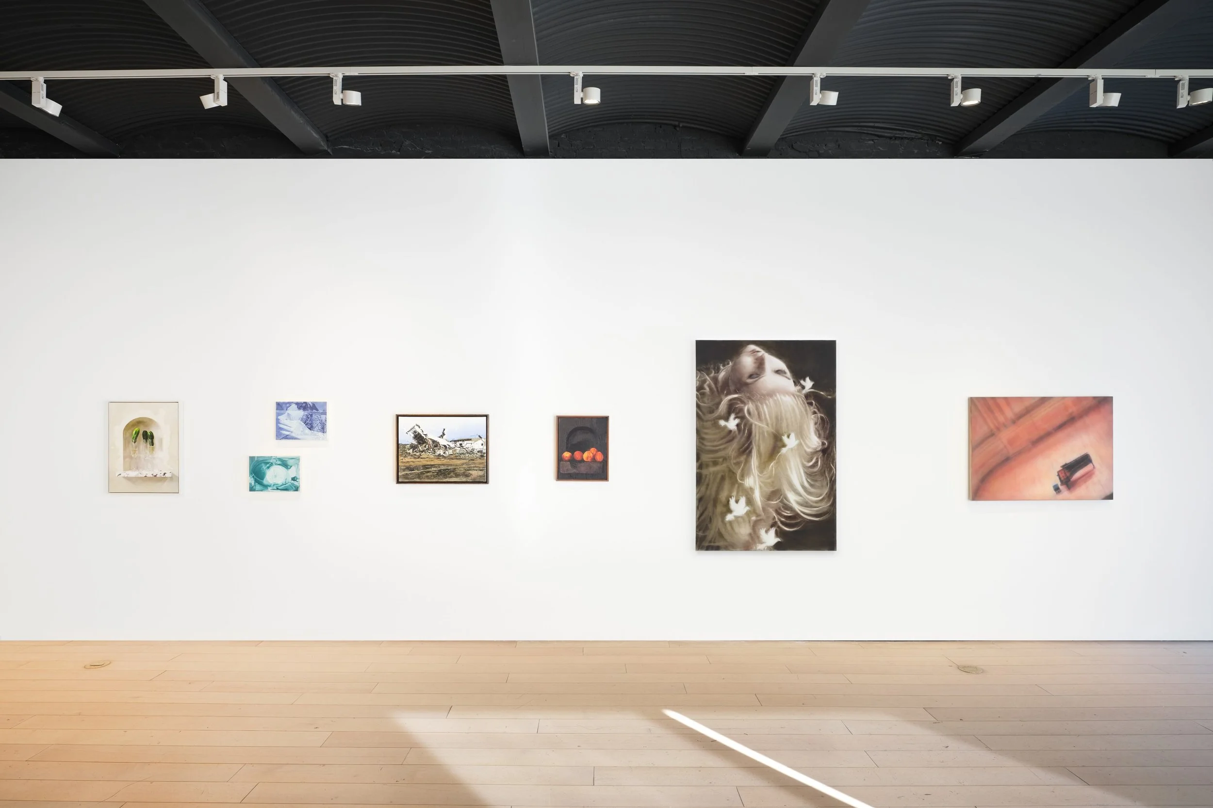 In the same room, Leon Xu’s Friends to lovers (lovers to strangers) (2026)utilizes airbrushing to produce a picture that looks like motion blur; elsewhere, Xu’s airy application method enhances a non-conventional aerial perspective of a piano in a concert hall, again imbuing it with a sense of arrested motion, almost flight. The cross-fades in Julia Mauri’s works enact a similar temporal arresting, but instead of freezing camera movement, they freeze montage, turning the grand dissolves of Old Hollywood cinema into architectonic compositions that operate on two planes at once.