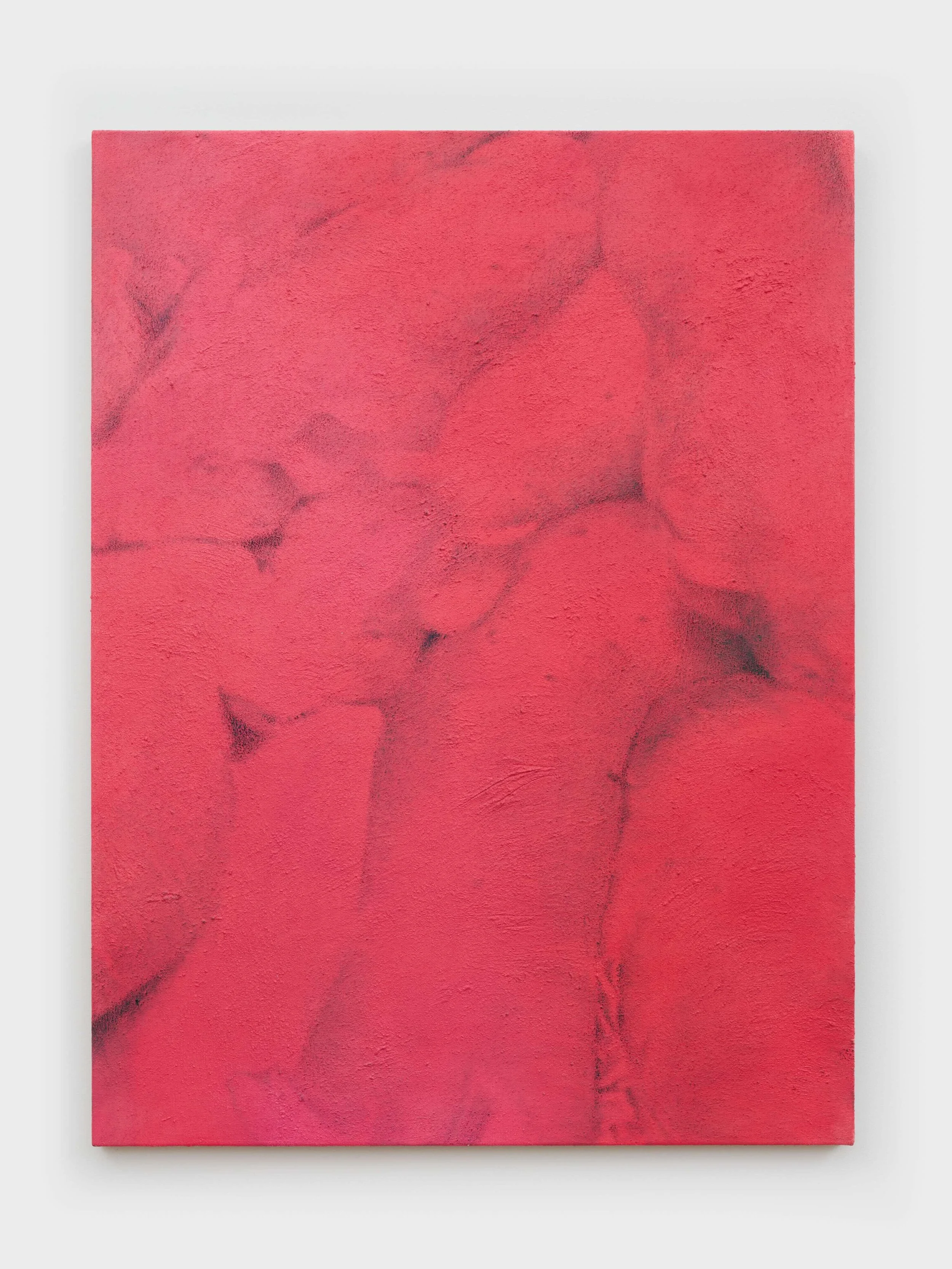 Photographic technique and painterly materiality come together perfectly in Nana Wolke’s 00:02:46,625 --> 00:03:35,750 (Earth Erotica) (2025). The painting construction appears as a red field, seemingly undifferentiated on first glance, but soon resolves into an overhead image of a mass of pigs, bodies squeezed in so tight their black outlines are just barely visible. Many of its compositional elements feel like they take meaningful cues from lens-based imagery—the perspective, for one, which is top-down and cropped, implying a kind of impersonal video feed, not to mention the color, which feels like heat-mapped surveillance. All of this is embedded in a thick, pebbly substrate of gesso mixed with construction sand, giving the entire painting a grainy feel and a uniform texture. The picture feels at once thickly tangible and one-dimensional, like it’s embalmed behind a mediating layer.