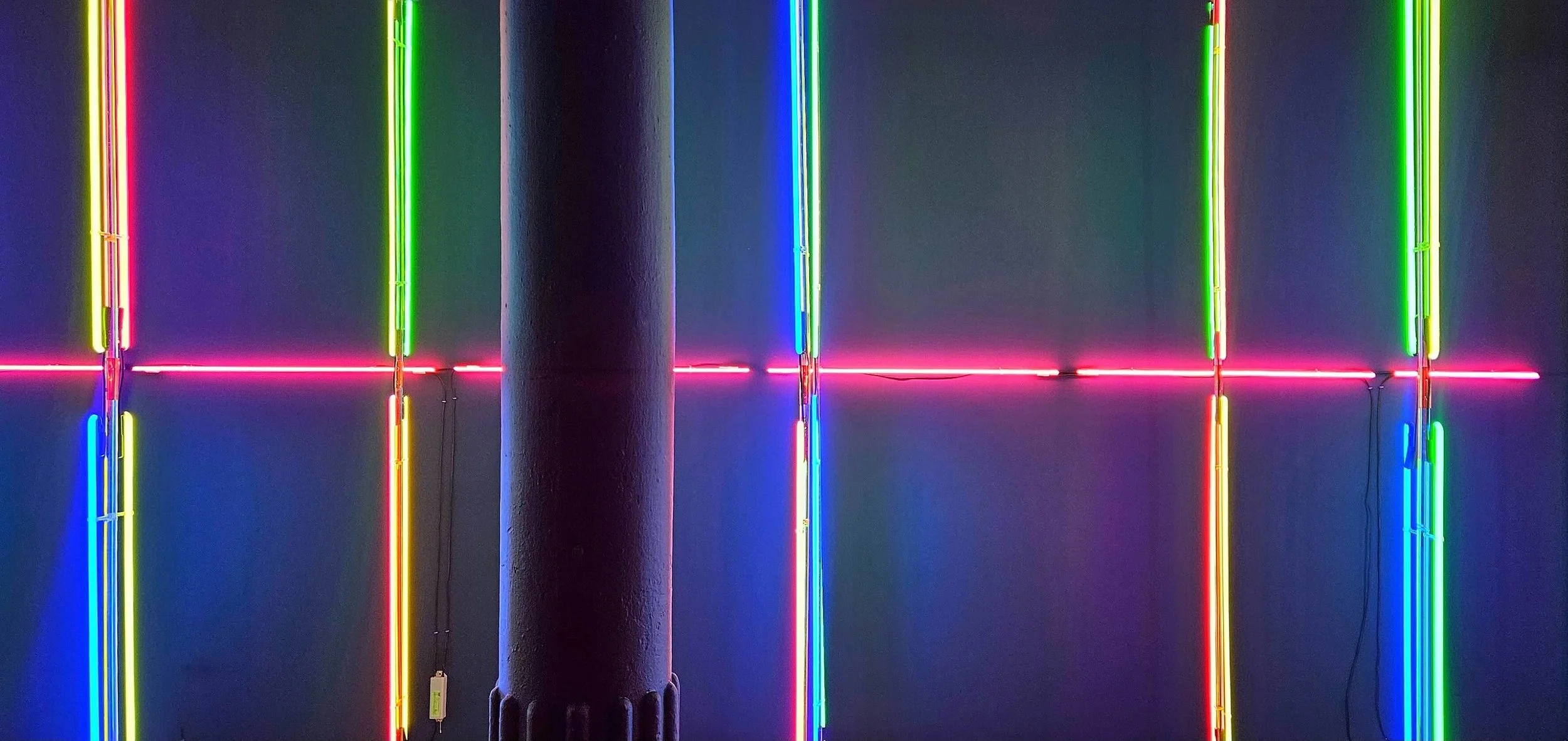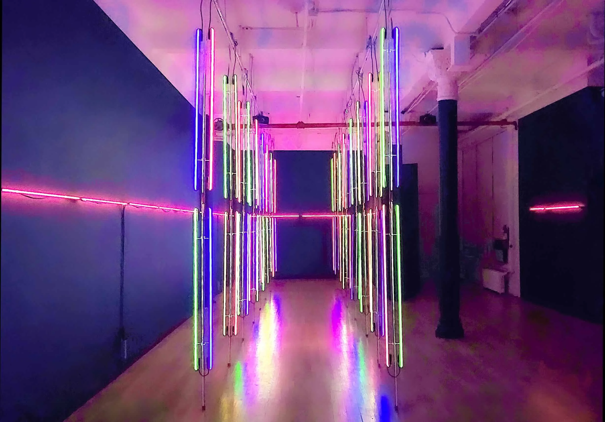 At first glance, the work appears restrained. Delicate neon tubes are arranged in vertical columns, tracing lines of color through the space. This initial sense of stasis and the synthetic register of neon light are deceptive. Only when you move through and around the structure do you slowly notice the elemental nature of neon’s noble gases, softly colliding and releasing energy that emerges as a faint, rhythmic pulsing of light so subtle that it nearly slips beyond recognition. As the eye adjusts and the body begins to synchronize with this nuanced modulation, the colors seem to breathe along with you. This shared rhythm produces a curious intimacy between the viewer and the work, collapsing the distance typically maintained in a gallery setting. This sense of intimacy is deepened by the installation’s sonic environment, an immersive envelopment of sound that feels as though it is meant to be internalized by a continuous field of resonance.