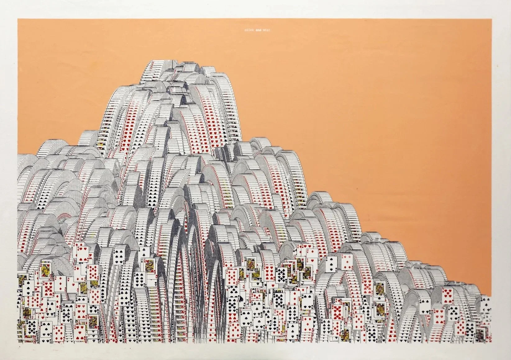 For the Click and Win! series, Quan uses large multilayered silkscreen prints on canvas to hark back to those endless hours of Microsoft’s Solitaire. Using different pastel-colored backgrounds, the pieces immediately recall the moments when one wins a game and all the cards are shuffled outward, or when an unfortunate player must suffer the anguish of a frozen computer screen and the cards are stuck in muted duplication. In this show, the prints produce less anxiety than they do in gesturing that silent joy in what is already too familiar.