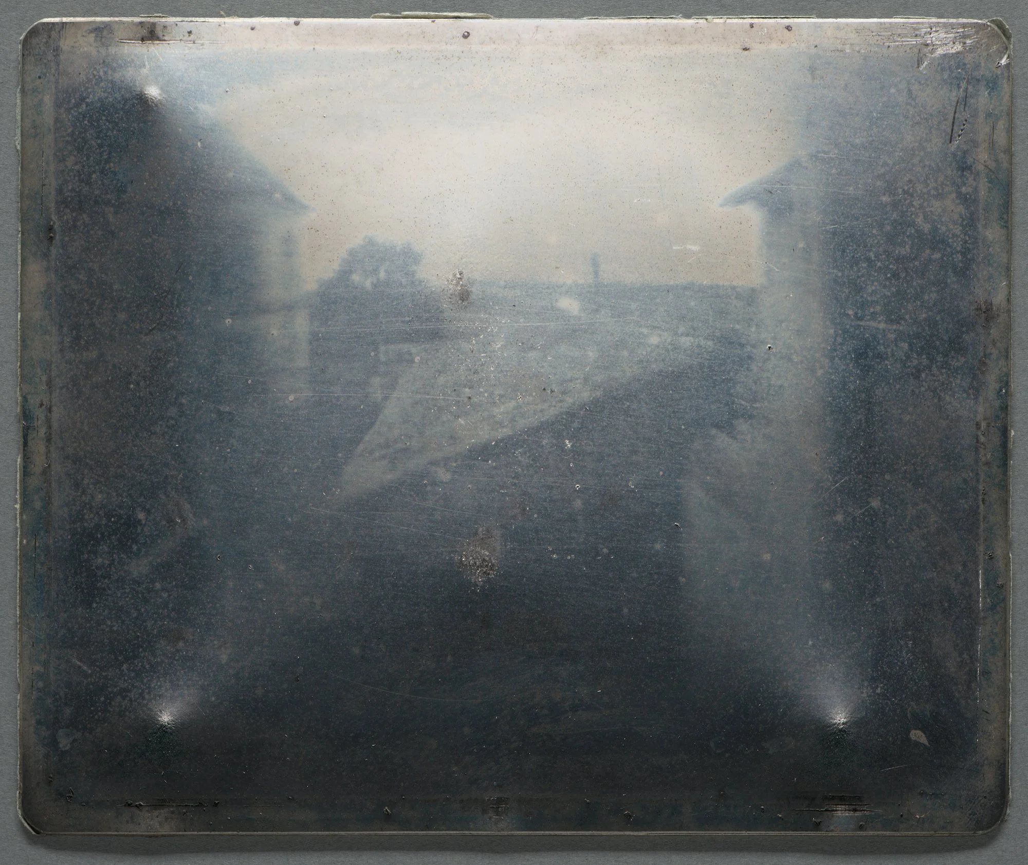 The first known photograph presents a series of outlines of rooftops taken from a second-story window by Nicéphore Niépce in 1827, an experiment using rudimentary materials coupled with a long exposure time. Viewing View from the Window at Le Gras today, you will see passages of light and recessed angular structures. The value of the image does not lie in the clarification of place, but rather, in the refraction of light and darkness as a marker of existence, the materiality that both creates and dictates the chasm of the ephemeral. Nothing else is required of this document beyond its role in the evidence of time and the individual as a witness to it.