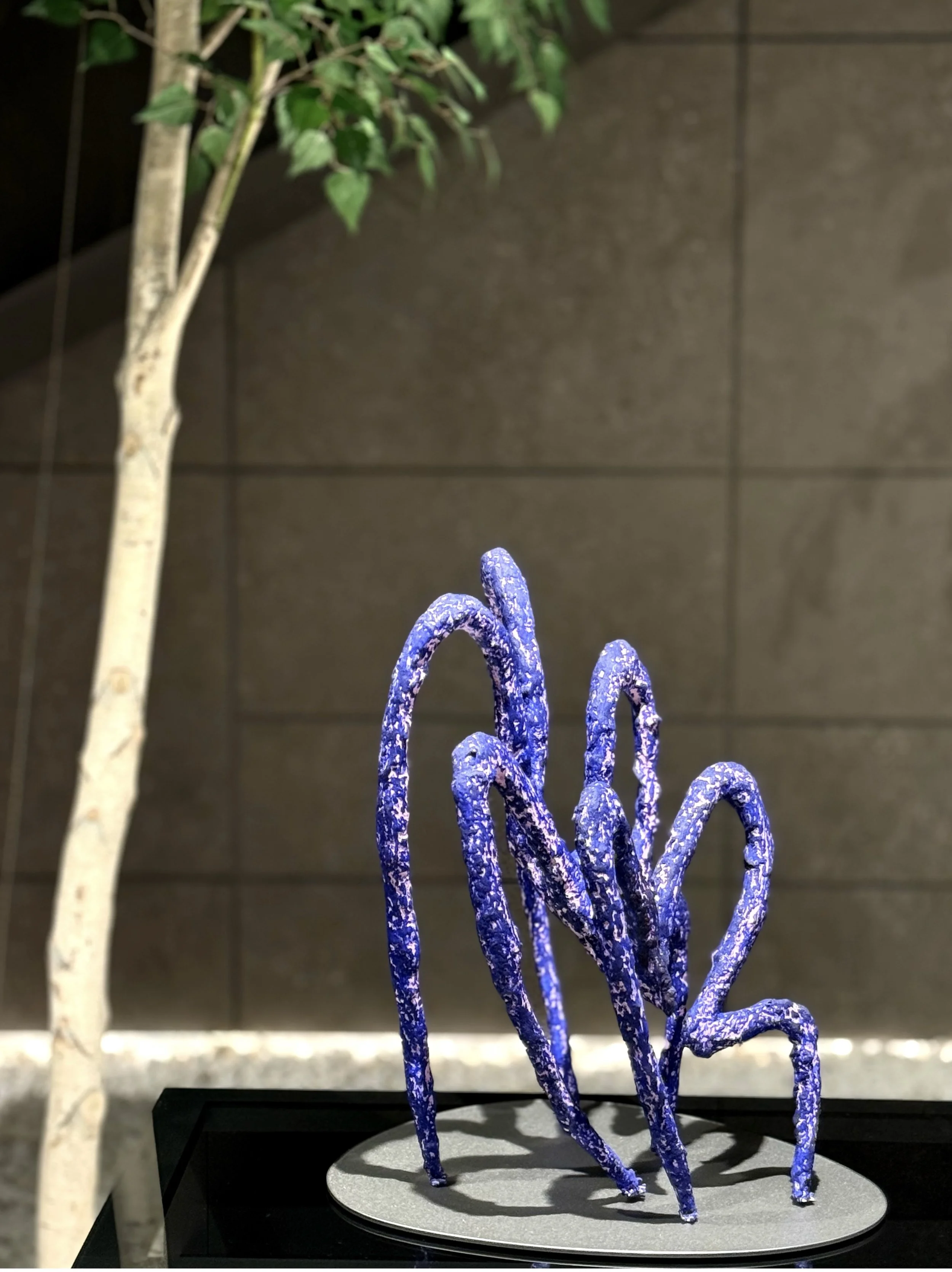 Rooted in line, Carrie R’s work emphasizes the gesture of crawling, sprawling, and perching, each imbued with a subtle menace. Less about anatomy and slipping into expression, her works tackle suspension mid-movement. Her forms arch upwards on elongated “legs” tapering into pointed digits. Their matte, rough surface heightens an insectoid presence, inviting the viewer to imagine their monstrous or animalistic roots. Vibrant colors ground her sculptures in a contemporary register, while their forms draw from a lineage of posthumanist practices that embrace the abject and recast the body as hybrid and unstable.