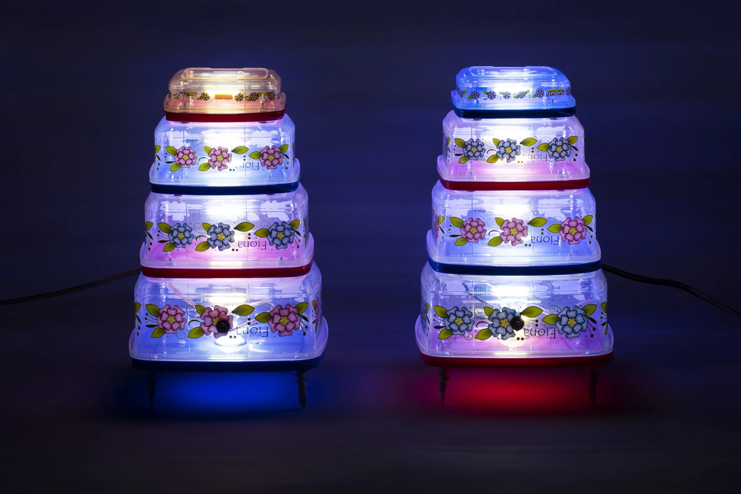 Chris Beeston’s work incorporates found, mass-produced vintage objects paired with light or video. Several sculptures stack Tupperware into geometric towers, pierced by beams of light that illuminate the floral decals on their plastic surfaces. The primary-colored lids in red and blue heighten the architectural quality of each form, while also harking back to the Fisher-Price Rock-a-Stack toy. The stacking effect elicits corporate angst of Sterling Cooper’s 23rd-floor offices Mad Men and the ever-hopeful American man’s quest to rise to the top. Beeston resists overworking his materials; instead, each one confidently interrupts our acceptance of capitalism in everyday life. Inverting the Tupperware becomes another clever riddle—a literal toppling of our perceptions.