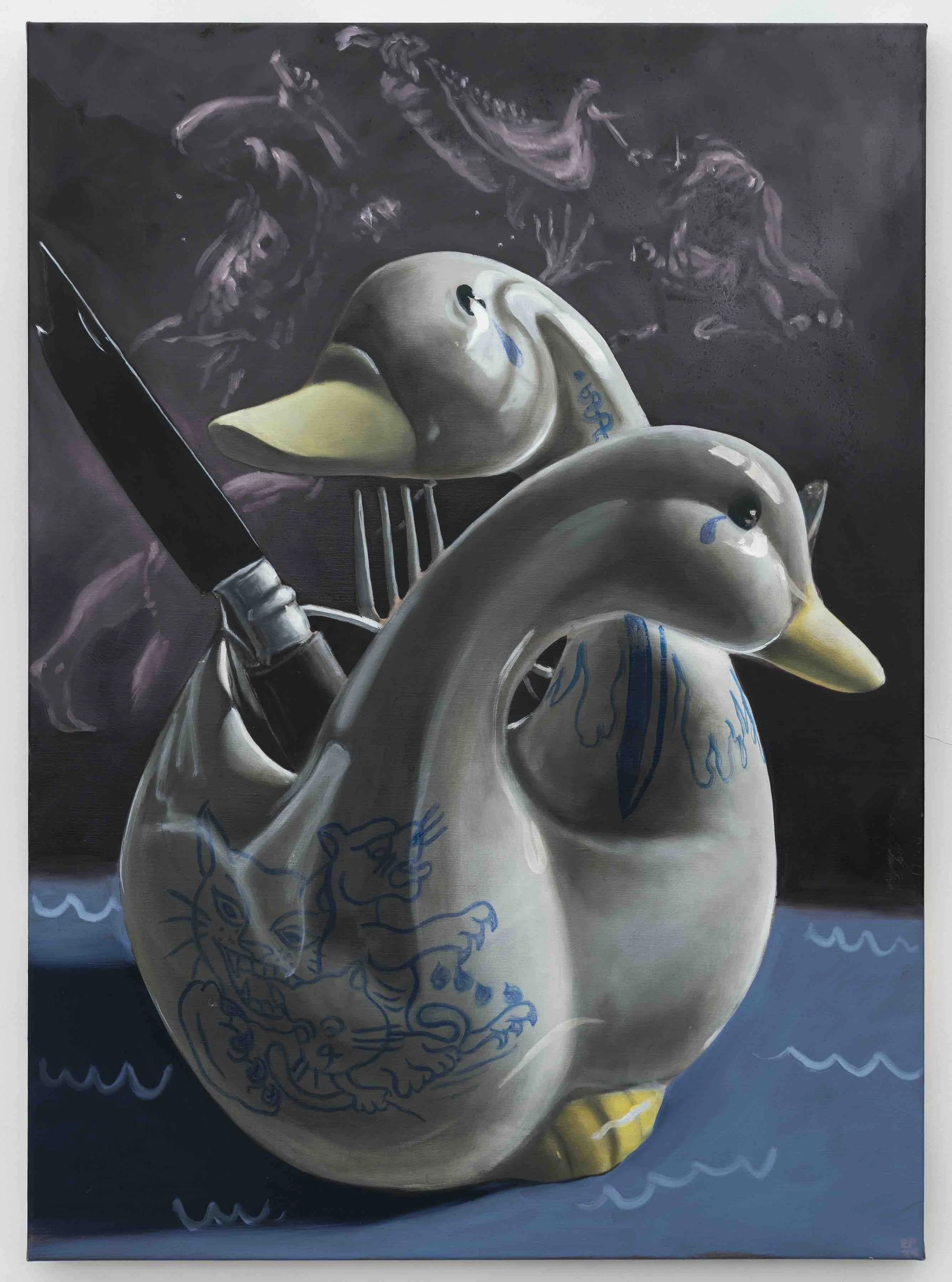 CG: In Can and Able, two glossy porcelain ducks streaked with tears double as vessels for cutlery. Instead of retelling the story of Cain and Abel—the first brothers born to Adam and Eve, whose rivalry ended in murder—you reincarnate them as banal, ornamental household décor. The painting collapses that cycle of violent jealousy into something absurd but fragile. What are you critiquing through the use of larger narratives like this, and what draws you to working with them as part of your conceptual framework?
