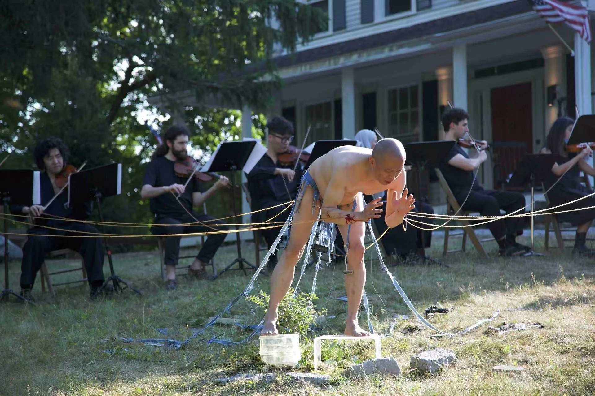 Sabriel’s Consolation took place on the lawn in front of the House on the Hill at Arts Letters & Numbers in Averill Park, NY, on July 19, 2025. At nearly 40 names long, the full credits list includes everyone who lent an impromptu hand, from volunteer mime-violinists to the person who carried a folding chair across the lawn for He to sit on. A film of the piece is forthcoming. Translations from quotations originally in Mandarin are by Lu Gao.