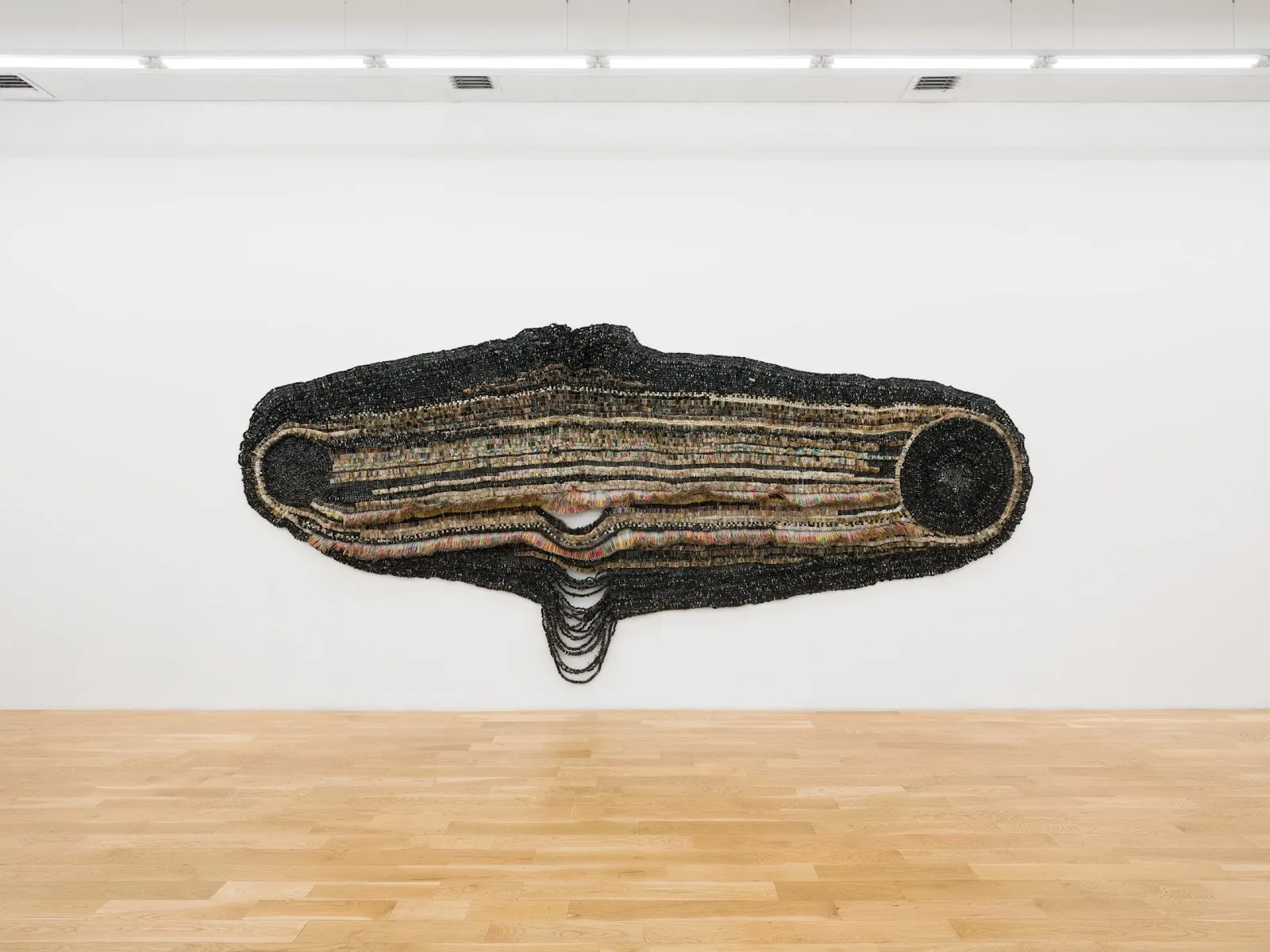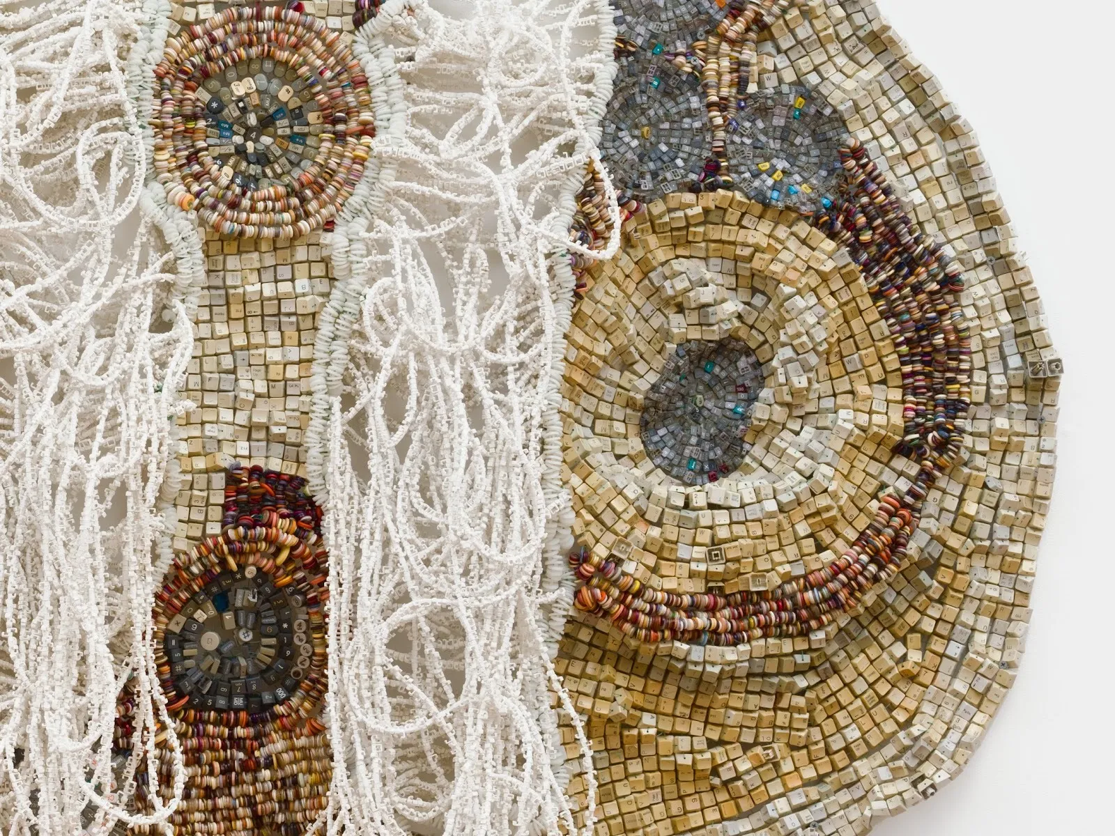 From a distance, the exquisite assemblages in Moffat Takadiwa’s Second Life, on view at Nicodim, radiate opulence. With their cascading strands of pearls, shimmering iridescent mosaics, and undulations of densely beaded coils, the compositions are a testimony to craftsmanship, but they are also an illusion. With a step closer, any given work will begin to dissolve and distort. Much like with an Impressionist painting, proximity changes one’s perspective. Up close, the materials of Takadiwa’s compositions reveal themselves as refuse. Keyboards, bottle tops, buttons, toothbrush heads, and pen caps are just some of the recycled elements used to create his sumptuous displays.