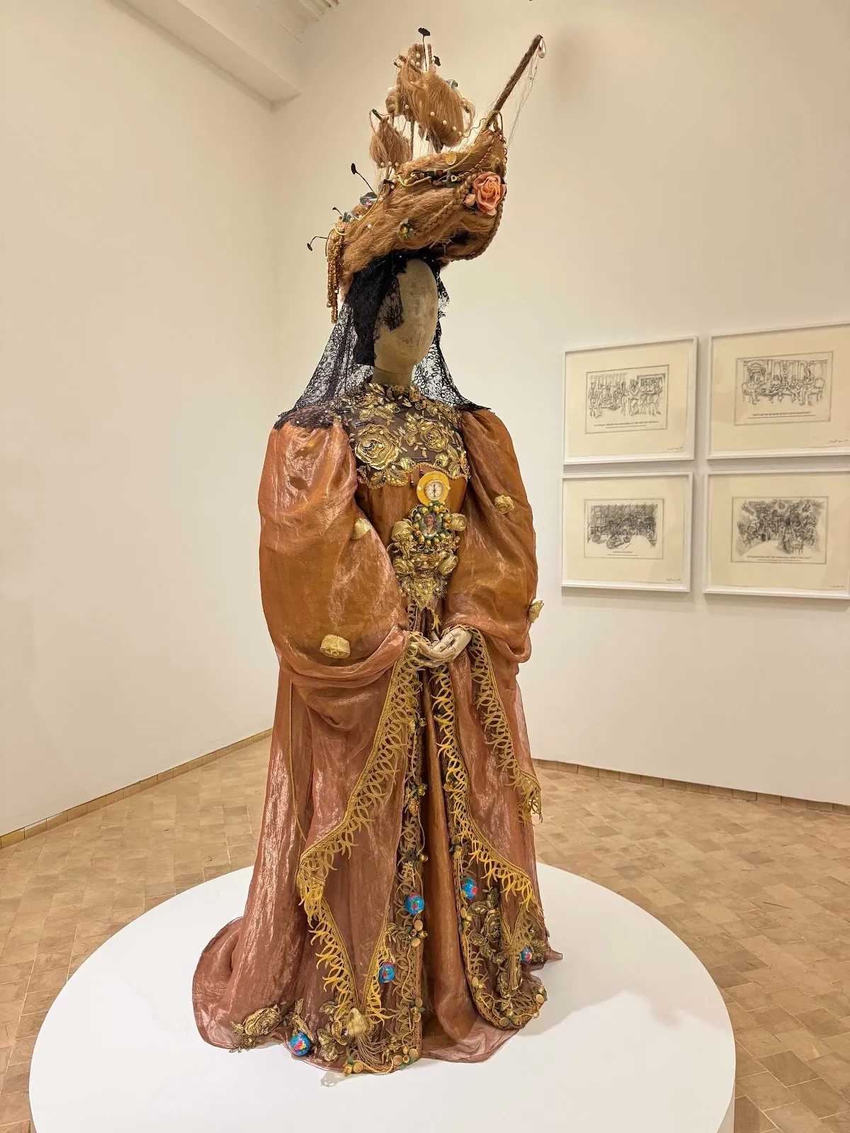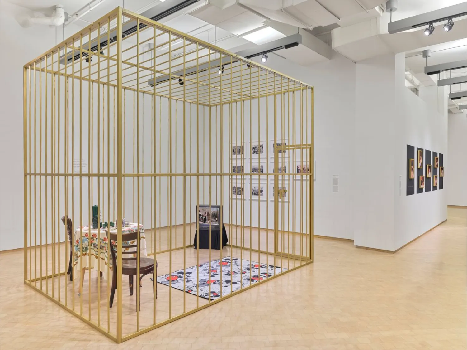 Moving from flat image to more conceptual multimedia installations, Two Undiscovered Amerindians Visit the West (1992/2025) offers a fresh take by remixing Fusco’s earlier collaboration with Guillermo Gomez Peña. Though not the centerpiece of the show, the gold-painted cage, into which viewers can enter, draws attention to itself by its sheer size and novelty. Bolstered by the textual and visual accompaniments on the adjacent walls, the cage conjures both past and present images of a type of carceral violence and a voyeuristic handling of dehumanized indigenous bodies. A container for the barbaric Other, this porous golden prison also features, unironically, a prominent Mickey Mouse carpet and a small television set playing footage of Fusco’s earlier performances of the original exhibition tour.