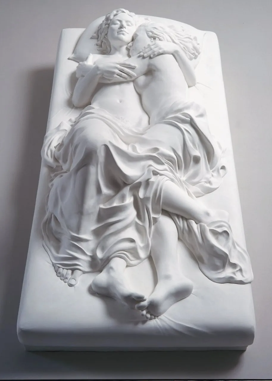 A new series in marbled wallpaper nods to Cronin’s sculptural base and to the subtle ways politics can quietly charge a work. One piece echoes the green marble of the U.N. General Assembly Hall, the iconic female silhouette embodying the backdrop of where global debates (many on women’s rights) unfold. Marble, after all, is Cronin’s bedrock: Memorial to a Marriage (2002)—widely regarded as one of the first public LGBTQ+ monuments in the United States, thirteen years before nationwide marriage equality—was carved by Cronin in Carrara marble and first installed at Woodlawn Cemetery in the Bronx. The monument shows Cronin and her partner, the artist Deborah Kass, in an embrace modelled after Gustave Courbet’s The Sleepers (1866), turning a canonical male-gaze image into a feminine and feminist monument. “Almost twenty-four years ago, monuments were white noise,” she tells me. “Now we understand public art is a place where we can work out our values about democracy. I don't think any art form is closed or done until everyone who wants to speak through it can use it as a tool of free and artistic expression.”