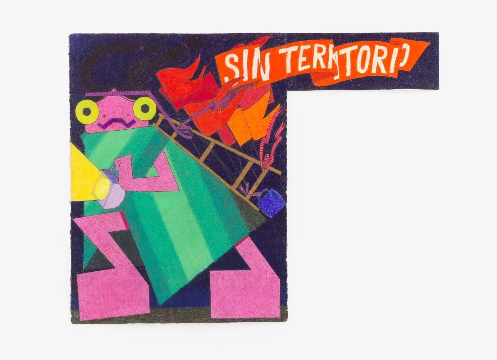 Welcoming us to the gallery, there is an activist march of pastel and charcoal coquí(frog)-esque figures that parade in a full circle surrounding the room. Barrera’s apparently cheerful, vibrant, and somehow “cute” characters are not marching against anything, they are marching in favor. “I think of them as already free people. They’re moving without borders,” she explains, “I wanted it to be less about protests and more about ritual and festival. Imagine a different kind of reality, like in autonomous zones or encampments, where people build something else for a short period of time.”