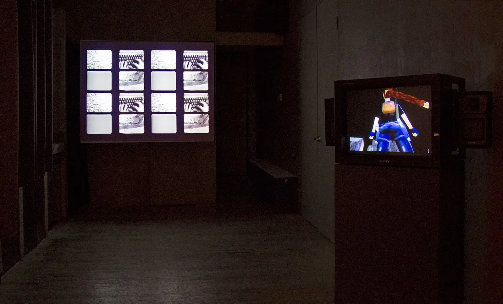 Nearby is Peggy Ahwesh’s She Puppet (2001), a truly captivating video piece recorded within the Tomb Raider video game. The player character, Lara Croft, is subjected not just to in-game torture, being torn apart by tigers, piranhas, and gigantic vultures. She’s stuck—in narrow passageways, in freezing or scorching temperatures, and especially in the gaze of the game’s camera function, which Ahwesh uses to invasively ogle the character’s famously exaggerated proportions. This is machinima-as-détournement, an exploration of what logics underpin these mass-distributed digital worlds, and who they’re aimed at stimulating. Decades of technological development lie between this piece and Wong’s, and the staging feels instructive: this is where we’ve landed, a fetish-doll torture trap?