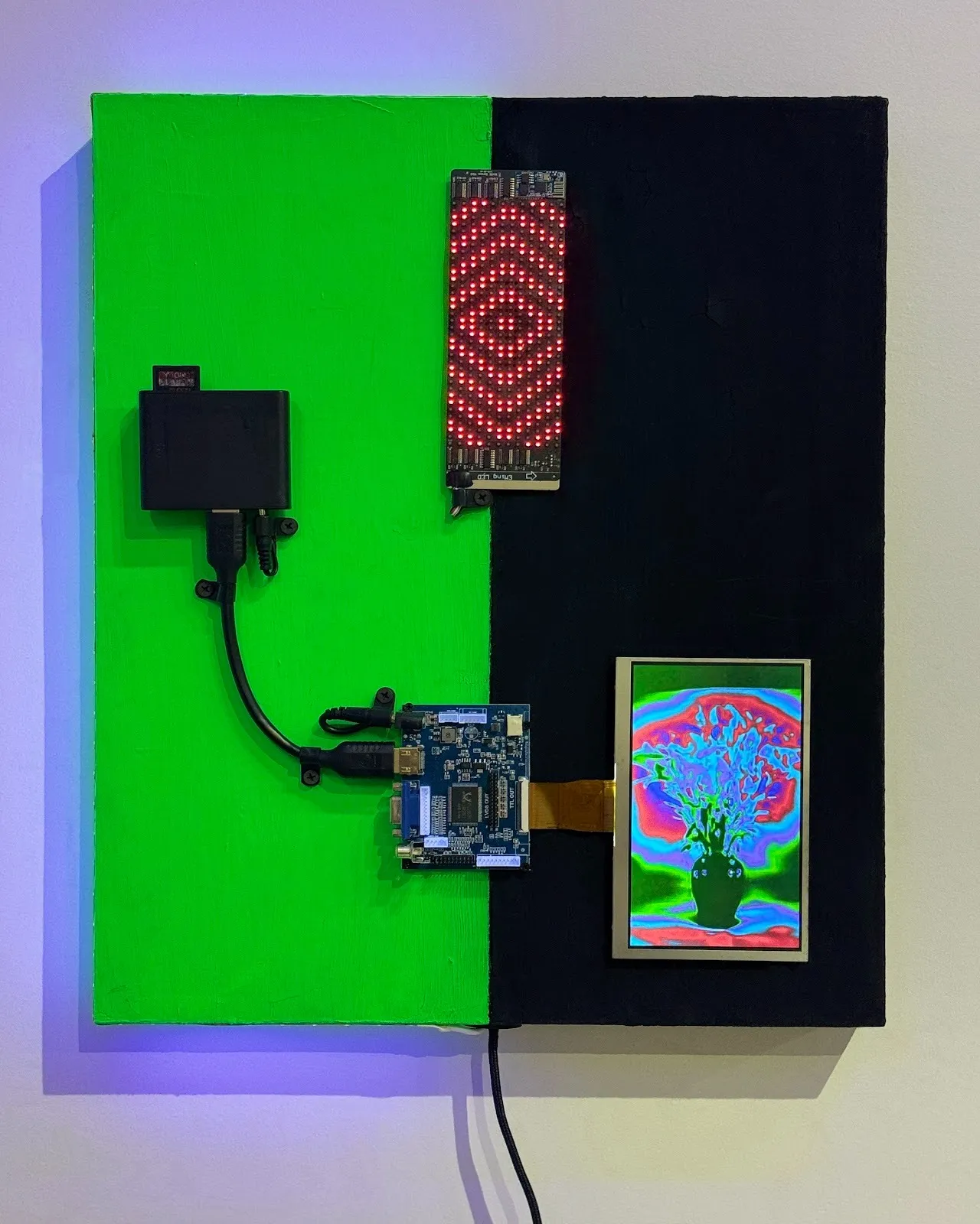 The tenor of these works is not uniformly liberatory. So many of them convey a creeping sense of confinement and constraint, like Les LeVeque’s Doppler Beaming #9 (2022), which alternates its display between a string of non-sequitur vocabulary and a heat-mapped still-life of a tabletop vase. It feels like the code in these works is rattling its own cage, and the result is a highly effective antidote to the bland branding of all technological development as utopic. In fact, amid the exhausting ongoing debates over whether recent AI technology can possess anything like genuine intelligence, I found that works like She Puppet and Putto 2.2.2.2 felt bracingly alive. They elicited in me something like sympathy.