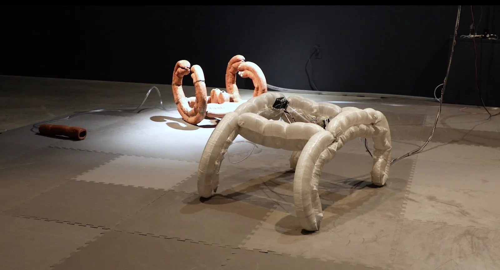 This theme carries over to an equally troubling array of works along the same wall. In Chico MacMurtrie’s Dual Pneuma (2024), digitally rendered soft sculptures bend and quiver in an empty gallery space. Again, an undercurrent of bondage—their contortions feel painful, but also exhibitionist. So does Michael Rees’s Putto 2.2.2.2. (2008), which pairs a cast bronze scorpion-homunculus with a flickering video of the same form, flexing and twitching in silhouette like some Silent Hill boss undergoing shock treatment.