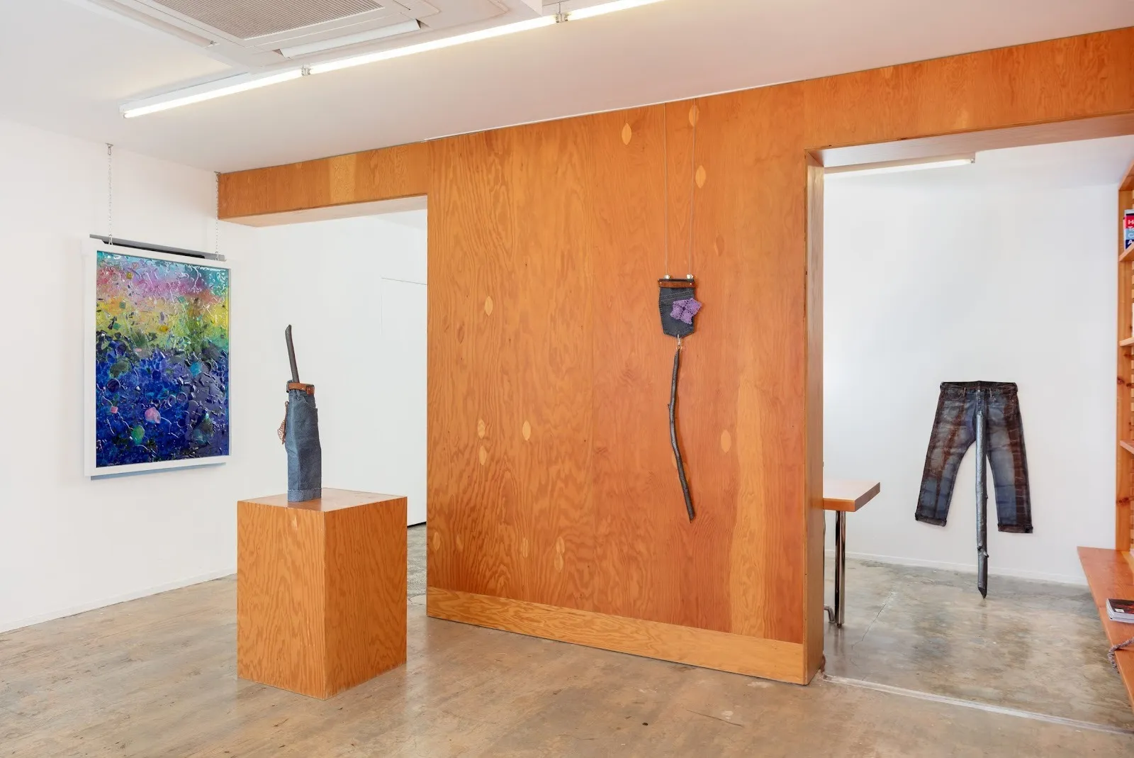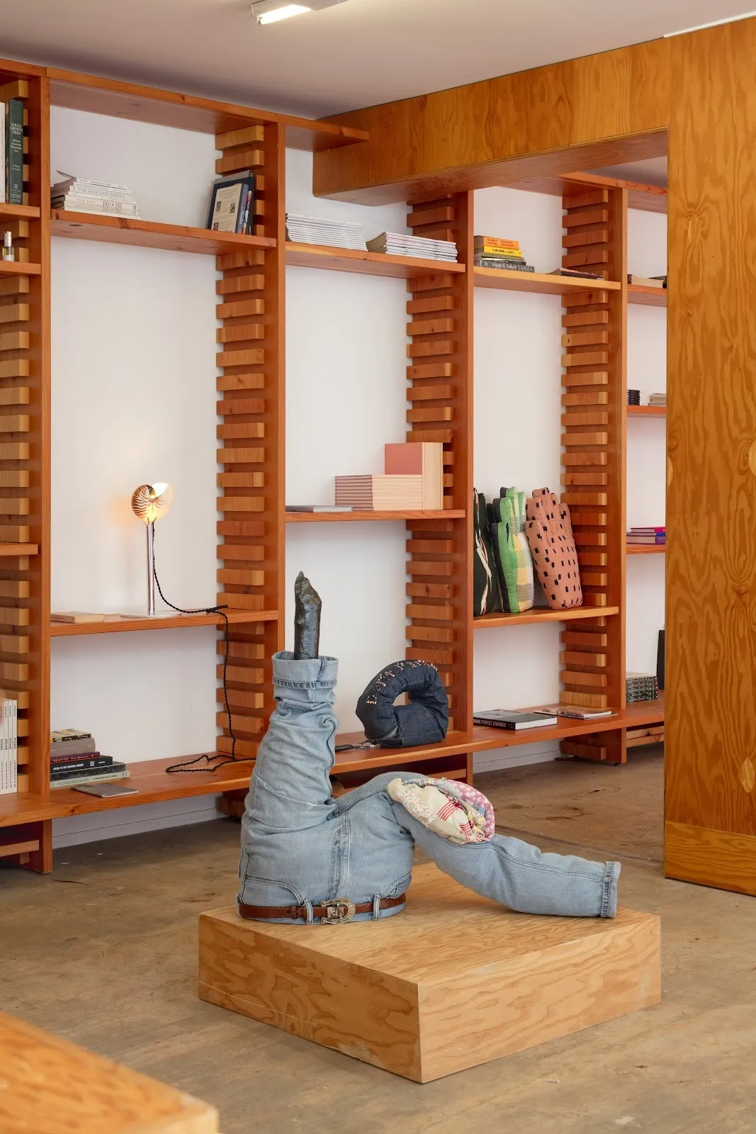 These garments aren’t meant to be worn, but they radiate protection: soft armor against erasure. There are echoes of non-gender-conforming domesticity, of DIY resistance, and of the rituals of reading that shape and shelter desire. Other works—twisted dungarees, beaver-sculpted sticks embedded in denim, all soft sculptures—extend the show’s material vocabulary. They are sensual without being performative.