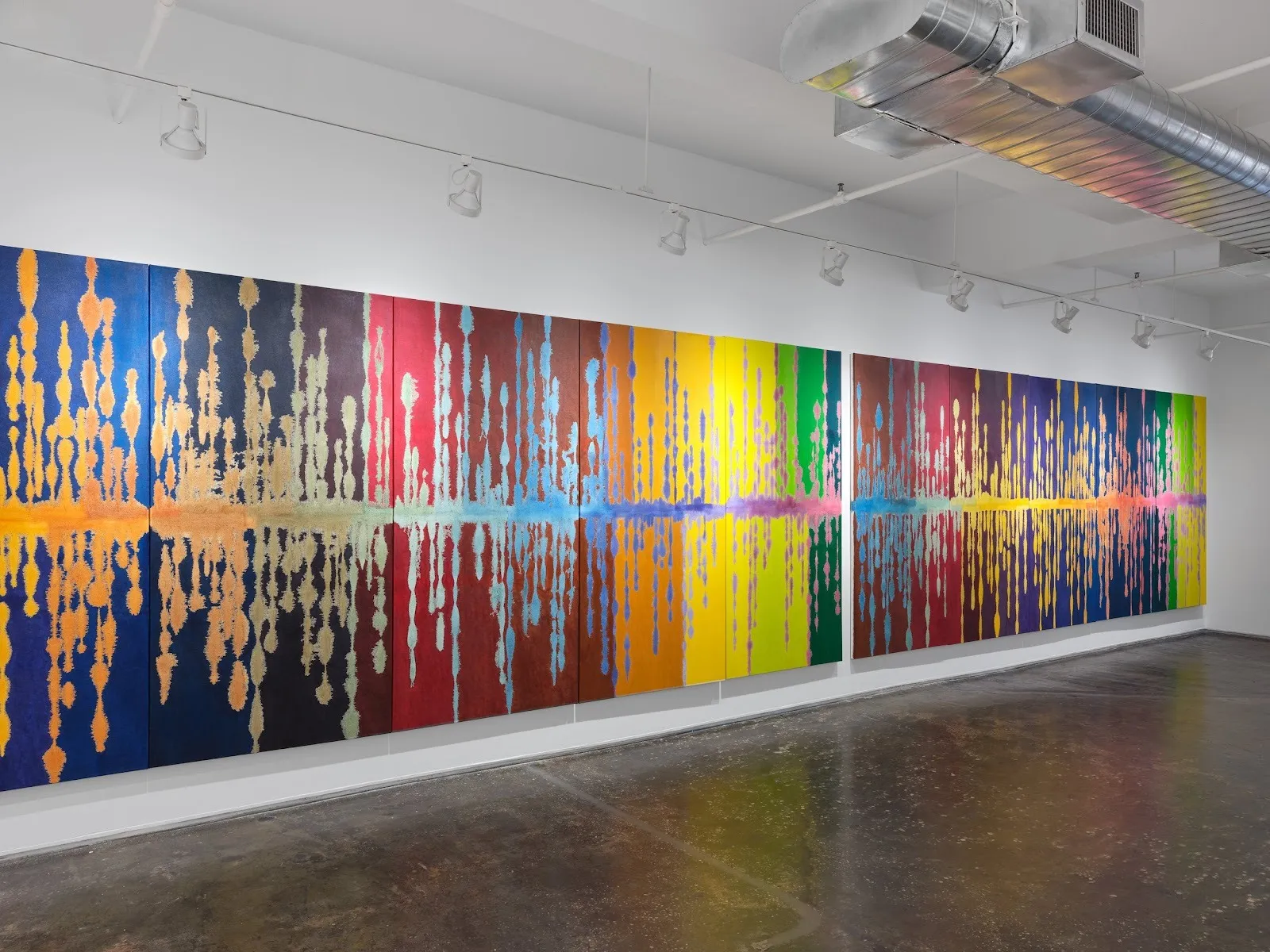 Commanding attention due to its impressive scale, On the Edge (2024–2025) takes up a whole gallery wall, surpassing thirty feet in length over multiple panels, and presents like a kaleidoscopic waveform. Contained within these undulating peaks and valleys, deliberate, popping colors creep out in front of equally contrasting colors behind them. Each paint stroke stains into the background color, creating an endlessly fascinating viewing experience that warrants investigation both from afar and up close, rooted in contrast. Kim’s massive work uses motion to convey a sense of time; the way these colors move in the space created by the artist is felt at an almost aeonic pace.