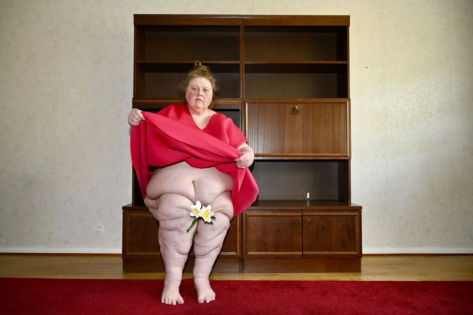 Touchdown by Venus, Iiu Susiraja’s solo exhibition at Gratin Gallery, takes a fresh swing at this long-standing debate. Susiraja transforms the gallery into a mute battlefield, staking a claim through self-representation. The exhibition presents fourteen photographs (fine art archival pigment prints) of the artist herself. She appears nude, often meeting the viewer’s gaze, her face marked by the Finnish expression tonnin seteli: the Finnish “expressionless expression.” She is surrounded by objects and props that, according to the press release, serve to “activate her remarkable body.” Susiraja rejects classical depictions of the female form, instead emphasizing her body’s “massive presence in relation to the modest scale of the middle-class, homey interiors in which [her] mises-en-scène unfold.”