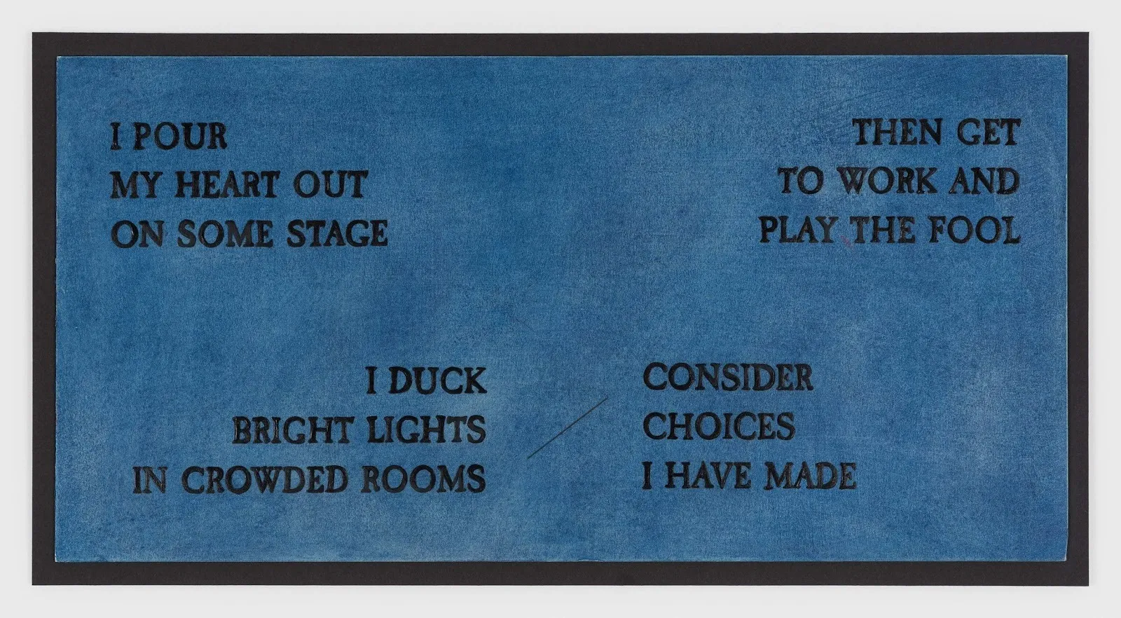 Kelly’s paintings are a choreographic exercise in confounding a biography. Clustered paragraphs of two-row grids sometimes tighten the narrative, condensing meaning and deciphering keys in just a few panels, and other times loosen the intensity of one climax after another. Often, a panel finds its mirrored subject, correspondence, or answer across the room so that looking is always doubled by the awareness of a second sequence in peripheral vision. Kelly stages a charged trail that recollects every detail of his life/performance. The gallery becomes a sanctuary and exam room saturated in devotion and self-surveillance. Panels that read “YOU ONLY LIVE TWICE,” “ADMIT,” or “GROSS CLINIC” don’t merely caption the work; they name the spectator’s relation to Kelly’s autobiography, that his life lesson could equally be our mantra for living.