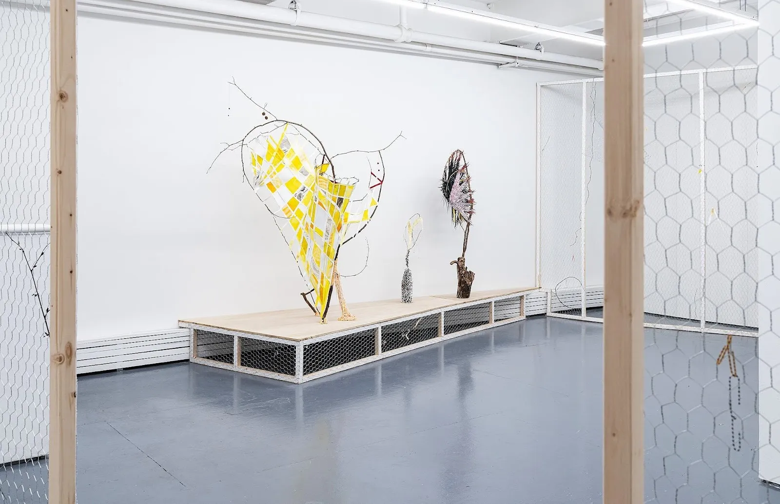 To make her abstracted, chicken-ish creatures, she uses accessible materials, gathering, cutting, and bending tree branches while they are still green, then fashioning interior paper frameworks that fix the branches into taut loops. She details them with a topography of adornments ranging from exquisite, quill-like, glossy paper coils to dried seed pods and balled-up wax from individually packaged cheeses. She then outfits the forms with bases or otherwise elegantly balances them—on plinths, on the wall, or hanging from the ceiling. For her show at TSA, curated by her husband, the artist Dominic Terlizzi, a flock of these sculptures is arranged in an environment suggesting a chicken coop.