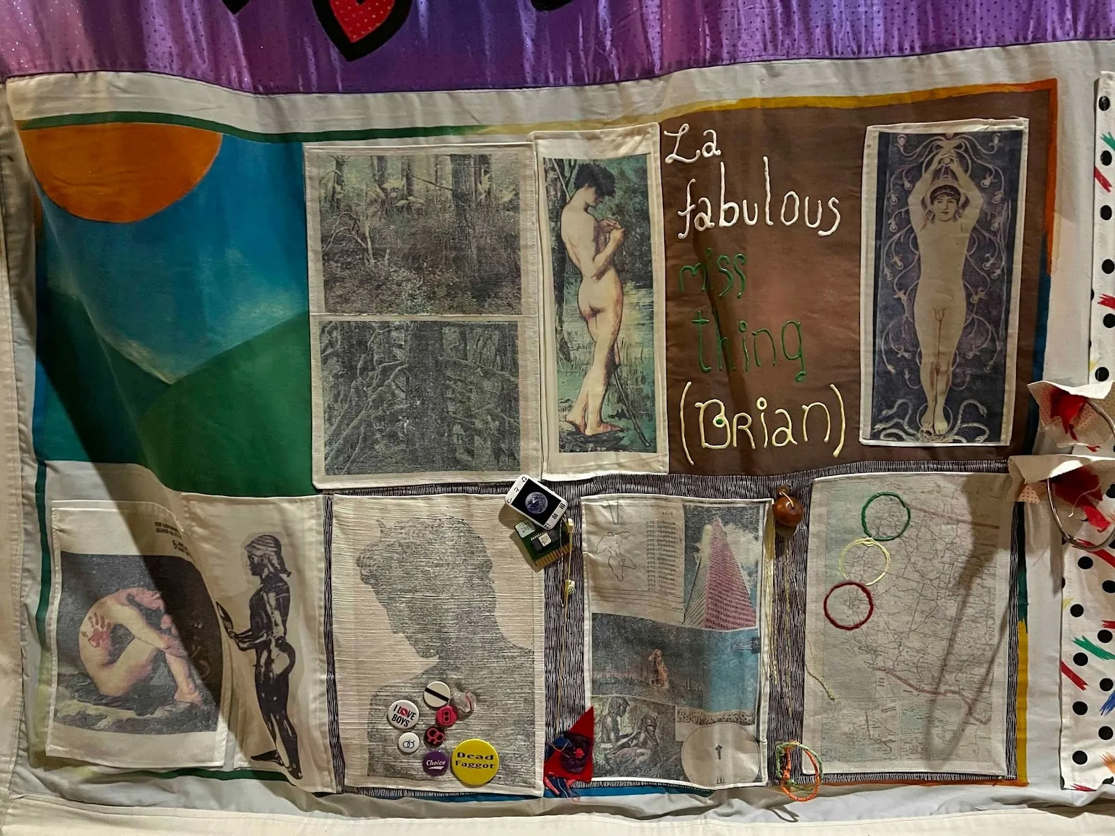 To arrive at the exhibition entails a walk down Commercial Street, past buff mannequins in rainbow spandex and sandwich boards advertising politically-correct drag shows, before reaching the carbon-gray quartzite slab marked “remembering” that drew Gessen’s ire, and climbing the steps to Town Hall. In the cavernous second-story space, quilts stretch across the floor and hang from the balcony overhead. In the center of one work, two silhouetted figures in adjacent panels marked “Todd Peramba” and “Michael D’Augustino” reach for each other’s hands; on another, “Rock Hudson” is spelled out in shimmering silver against a deep blue background streaked with stars, “HOLLYWOOD” arced across a rainbow in the bottom right corner; “La fabulous miss thing (Brian)” is scrawled playfully across another, to which an array of ephemera—floppy disks, bracelets, pins sporting “I love boys” and “Dead Faggot” slogans—is tenuously attached.
