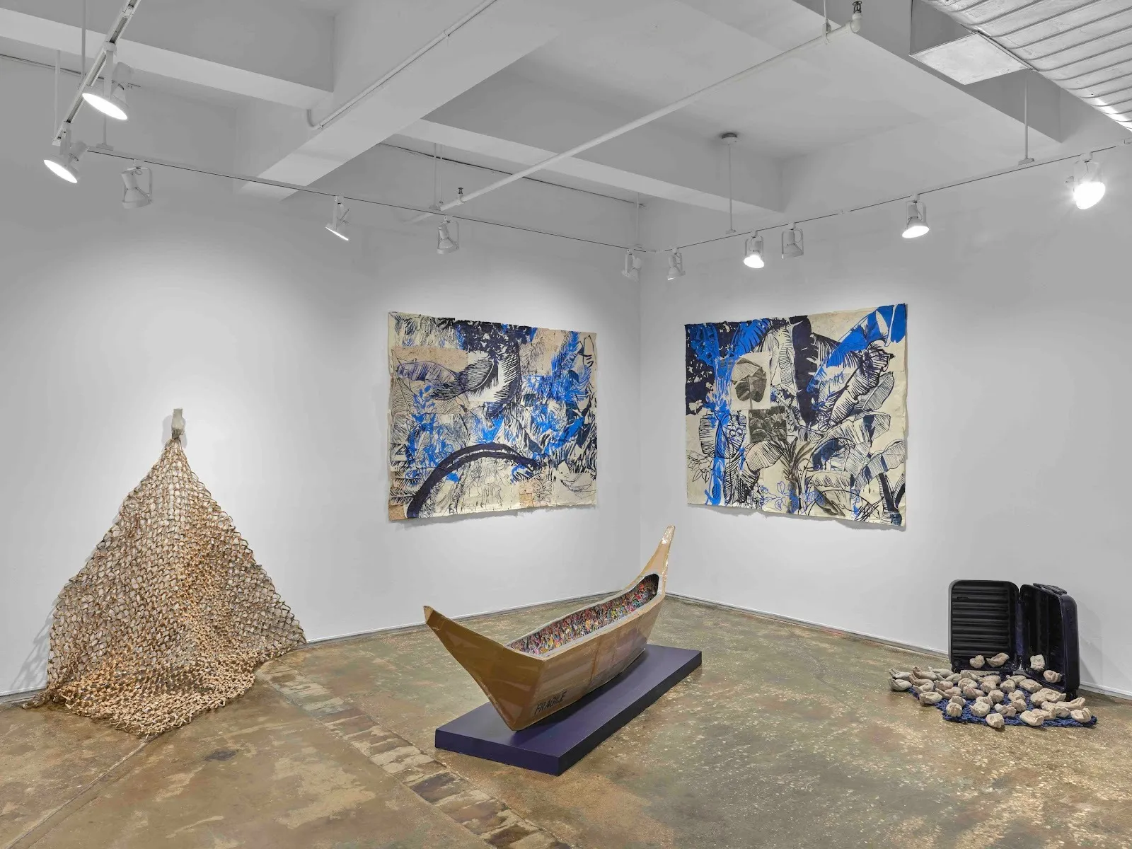 Alongside these paper works hang what feels like portraits of a wave. Just as a photographer attempts to capture their subject, handwoven fishing net grasps at the blue textured surface. Gupit’s Silver Linings (2025) series evokes the immeasurably complex emotions a resettling person might struggle with, like a knot in a throat, or an intricately woven rope. Together, the tangled shape of the exhibition recalls the ambiguity of migrant and diasporic experiences. In the sum of these varied pieces, personal narrative through generational memory bleeds into a broader diasporic community across the many histories of displacement.