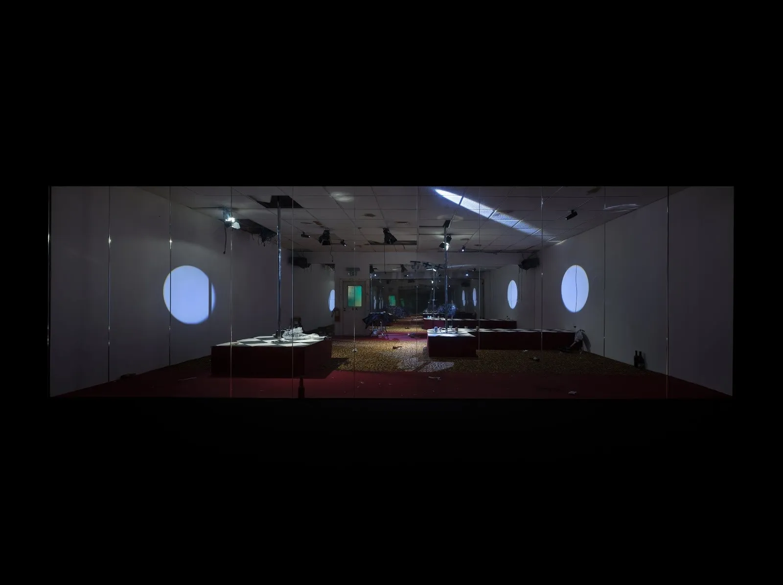 Until October 26, those who enter Management step into a black box and face a row of floor-to-ceiling windowpanes. Beyond them, fluorescent spotlights expose two checkerboard stages with stripper poles. Between the stages, a red carpet with a cheetah print rug strewn atop. Surfaces are littered with cans and other ambiguous debris. OBJECTS IN MIRROR MAY BE CLOSER THAN THEY APPEAR becomes the “seedy strip club” as described in the press release, installed in the gallery space under Vladislav Markov’s direction.