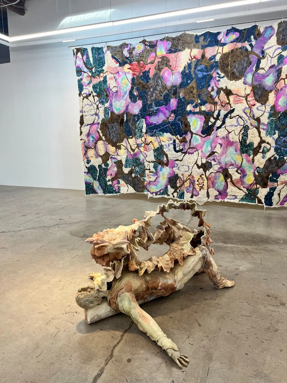 An explosion of texture consumes the Mother/Land exhibition space at Murmurs LA. The show houses the work of nine female artists who enact feminist readings of landscape and ecology through their use of organic materials and embrace of historically feminized craft traditions like weaving and pottery. Taken as a whole, the artists of Mother/Land destabilize notions of a nature-culture divide by presenting human and biological subjects as unbounded and interconnected entities. While all of the works presented in the exhibition carry weight as discursively-rich objects, two compositions strike me as particularly illustrative of the show’s underlying ideological principles.
