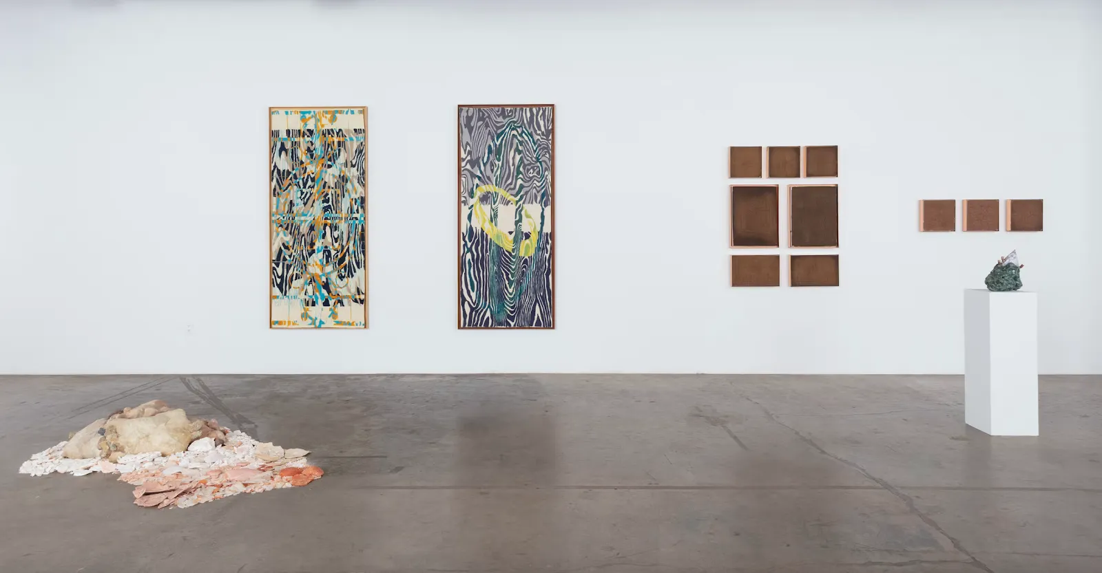 Directly in front of Shaw’s tapestry sits Katie Grinnan’s 2018 sculpture Double, a life-sized depiction of a human body bisected by several overlaid, jagged waves. Earthy and mottled in its coloration, the sculpture is a composite of Friendly Plastic, synthetic sand, and earthen minerals harvested from Death Valley.
