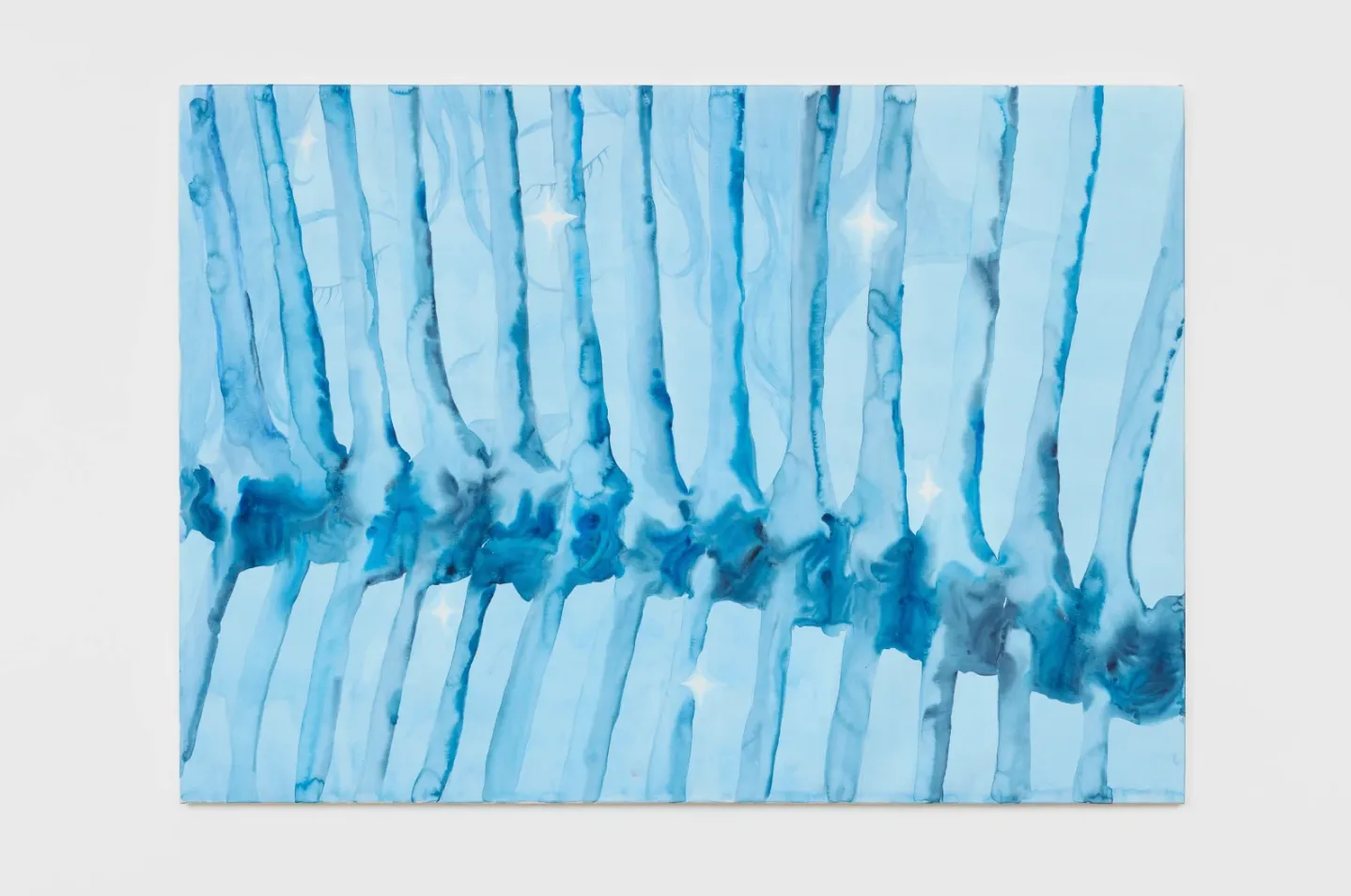 Meanwhile, at Frieze’s rotating space, No.9 Cork Street, Artwin Gallery presented eight artists from Central Asia and the Caucasus in To everything spurn, spurn, spurn, curated by Slavs & Tatars and Asya Yaghmurian. Exploring “disdain and contempt,” the exhibition purported to consider what it means to “kick back,” though it seemed more an exploration of materiality and process. For instance, Slavs & Tatars’ exquisitely-crafted blown glass orbs light the show's first gallery, while Nuriia Nurgalieva’s Come into My Bedroom (2024), a watercolor on canvas in sparkling blue shades depicting a close-up of a ribcage or skeletal structure, commands a hypnotic presence in the back gallery. In the act of “spurning,” or rejecting, these artists seem to embrace the beauty or coziness of home, as if retreat is an act of resistance and a place of repair.