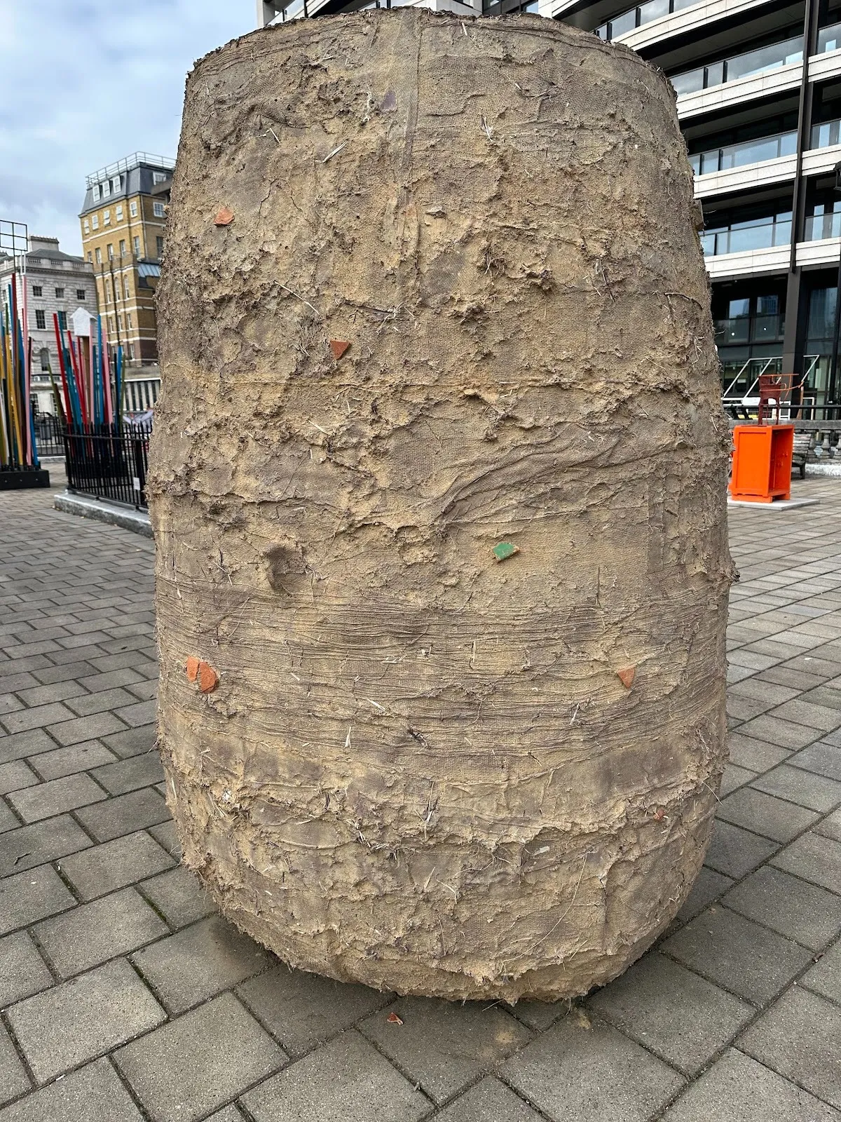 Finally, atop Temple Station is theCOLAB’s Artist’s Garden, a sculpture park to rival Frieze Sculpture. The all-women showcase here includes Jodie Carey’s twined vessels, which comprise Earthen (2025), made from casts in the ground using a hand-built form wrapped in cloth and thread buried underground, and then removed when Carey entered the void to retrieve the casts. The complicated process reveals an engrossing texture, registering the layers of dirt and detritus always present yet invisible below us. Shards of terra cotta, tangles of roots, and the remnants of the cloth and threads used in the casts are visible in the resulting vessels, which stand stoically erect in the busy urban environment and offer a contrast to its predominantly steel-and-glass architecture. On view until next spring, Earthen is a monument to women “weeders” recorded in the ledgers of nearby Arundel House since the 1500s. These women, now anonymous to history, tended to the gardens that beautified the grounds, removing what was deemed unsightly. The carefully handwrought surfaces of Earthen seem to harken to the tender safekeeping that generations of these women performed, now hidden in historical records. A monument to these women, the work also testifies to their resilience as well as the cyclical nature of “women’s work.” It also offers a transcendence across the present and the deep geological past: Earthen reminds us that we are all connected across time and place, even if we feel fractured by the moment.