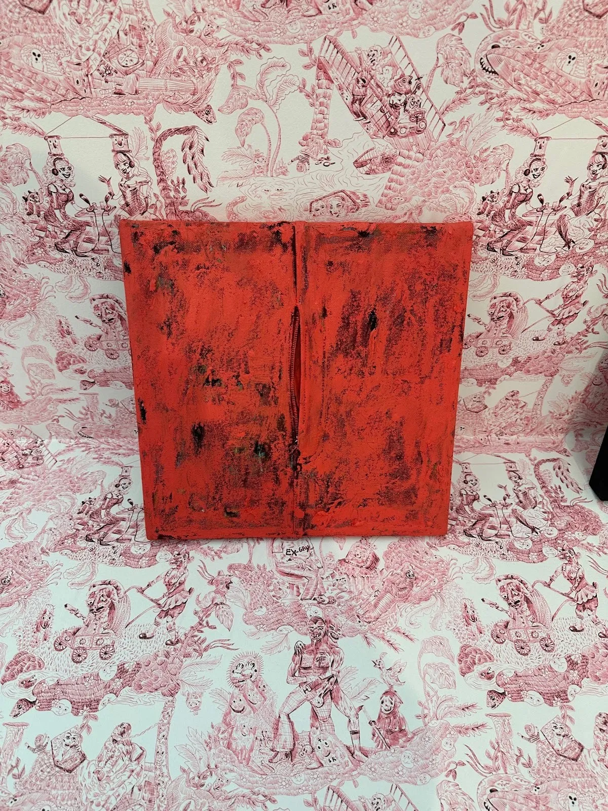 At the main fair, Mexico City's OMR presented works by Pia Camil, Claudia Comte, Alicja Kwade, José Dávila, and others within an “immersive environment” featuring custom red and white toile-like wallpaper by Alberto Perera. Far away, the wallpaper resembled the eighteenth-century decorative pattern popular in England and France; up close, it dissolves into an intricately detailed fantastical composition of vignettes depicting animal-like figures in various activities: driving, podcasting, resting. Ensconcing the booth, it both distinguished the booth from others seeking to imitate a white cube and knit together the disparate works within it. These included sumptuous marble works by Comte as well as an enigmatic, almost minimalistic painting by Camil from her BRAGUETA XL series (2022) in which she paints pure color directly onto denim (a frequent material of her sculptures). At the center of this small, bright-red work is a vertical incision with a zipper at the middle, creating a yonic void at its center. What can be born out of a tear or fissure? What is separated, this work seems to suggest, can be sutured.