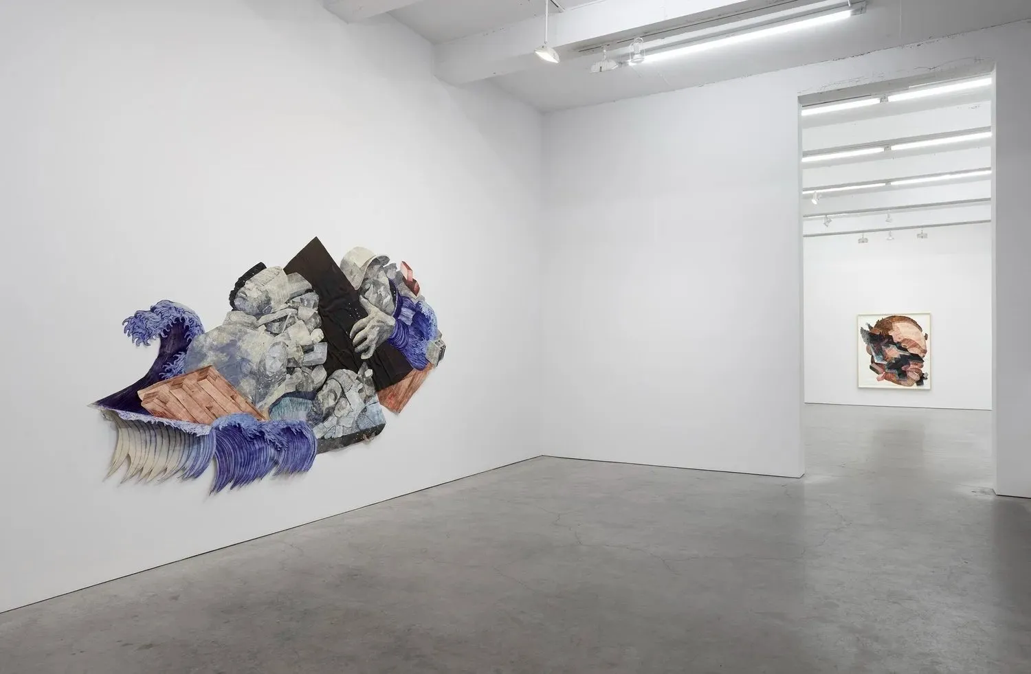 Yashua Klos’s Proposal for a Monument, currently on view at Sikkema Malloy Jenkins, approaches this question through scale, material accumulation, and a monumental figuration that unsettles the gallery’s architectural logic. Rather than presenting a singular sculptural monument in the traditional sense, Klos constructs monumentality across the walls themselves. Large-scale woodblock print collages assemble fragmented Black figures that expand outward, pushing against the boundaries of the white cube and transforming the gallery into a site of spatial and historical pressure. The figures that emerge are not singular portraits but accumulations of fragments: woodgrain textures, geometric grids, architectural scaffolds, and layered blocks of inked paper that form monumental busts and torsos. A cheek dissolves into a lattice of angular fragments; a shoulder merges with a network of rectilinear structures reminiscent of wood flooring. These bodies appear assembled under conditions of pressure, as though identity itself were an ongoing structure built from the materials of lived environments.